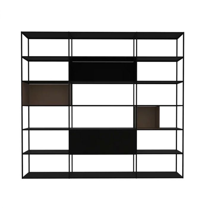 Matériaux : bibliothèque modulable démontable, 4 montants, 21 tablettes, structure en tôle d’acier courbé épaisseur 1,5 mm, peinture époxy noir cuivré, plusieurs caissons sont intégrés (coloris noir cuivré sablé et bronze), 3 caissons ouverts et un caisson avec porte abattante et fermeture magnétique