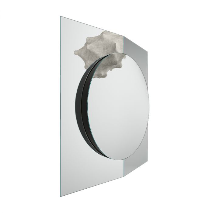 Miroir mural avec structure en bois formée de deux panneaux de miroir légèrement inclinés et d'un troisième élément central circulaire. Les finitions des trois panneaux sont disponibles en miroir, miroir doré, bronze ou miroir fumé qui peuvent être combinés entre eux.