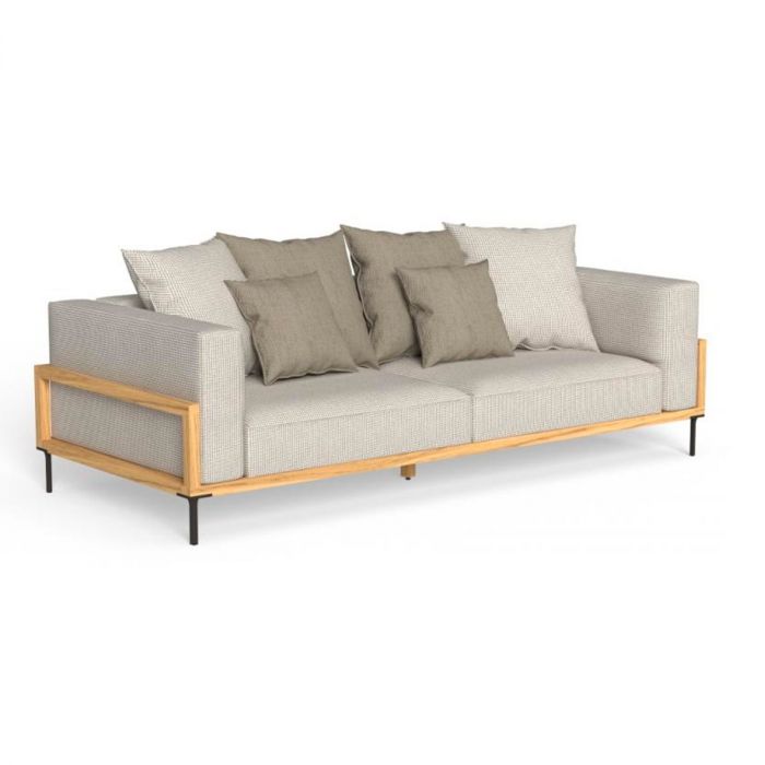 Le design de la collection CleoSoft Wood contraste la ligne rigide de la structure en bois du canapé d’extérieur 3 places avec celle plus douce des autres éléments. Le rembourrage volumineux de l’assise et du dossier, en tissu amovible, facile à laver et résistant aux agents atmosphériques, repose sur la solide structure en bois, un matériau qui caractérise toute la collection. Le rembourrage est en mousse à séchage rapide.