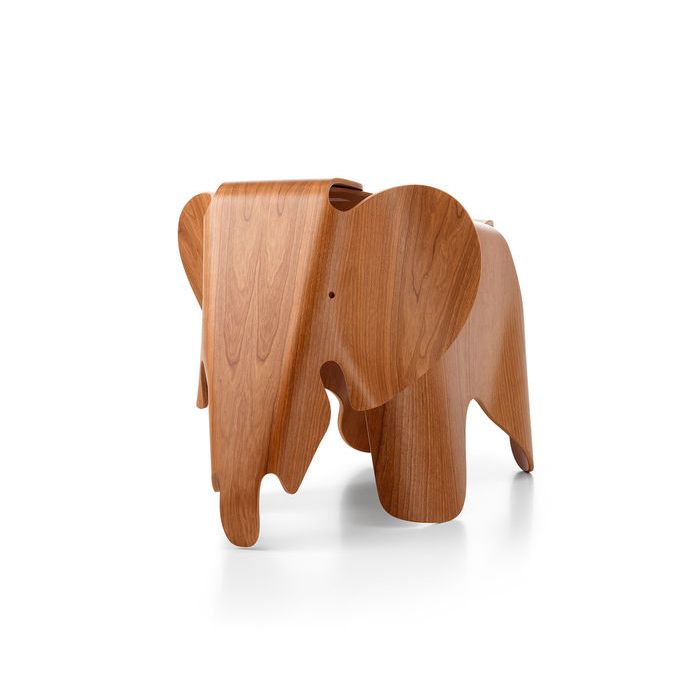 En 1945, Charles et Ray Eames ont créé un éléphant jouet en contreplaqué. Cependant, cette pièce n'a jamais été produite en série. L'in des prototypes a été exposé aux Museum of Modern Art à New York en 1946 et existe encore aujourd'hui dans les archives de la famille Eames. Après une première édition limitée en 2007, Vitra a lancé la production en série du Eames Elephant en contreplaqué en 2018. Il est disponible en version foncée en noyer européen et en version claire en chataignier. Le charmant pachyderme existe égalemet dans la variante Eames Elephant RE fabriquée en plastique post-industriel recyclé, idéale pour les enfants, ainsi qu'en taille plus réduite dans le même matériaux, Eames Elephant (small) RE, les deux variantes se déclinant dans un assortiment de couleurs assorties.
