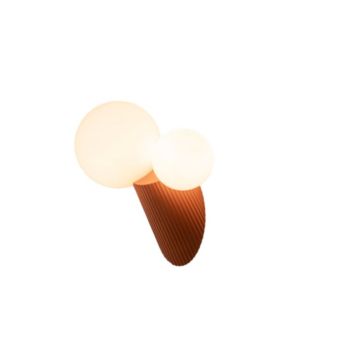 Land est une applique murale avec des diffuseurs de 10 et 14 cm de diamètre, en verre soufflé opale brillant. Support en verre qui le relie à la base en polycarbonate injecté, finition blanche. Fixation par système de filetage. Bases en céramique avec finition peinture acrylique. Système de fixation murale par aimants néodyme sur la base.