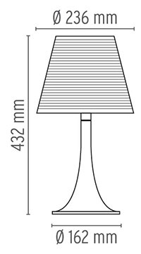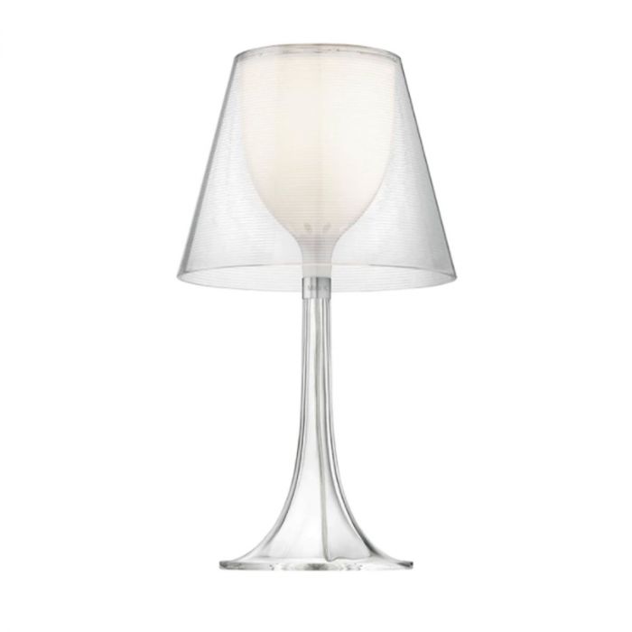 Lampe de table Miss K. de la marque Flos, réalisée par Philippe Starck. Cette lampe représente l'apologie de la classe et de la finesse. Ce mélange de courbes gracieuses, de matière derniers cris et de technologie innovante en font une lampe moderne très prisée dans l'univers du design. Elle est constituée, techniquement en PMMA (polyméthacrylate) entièrement transparent moulé par injection, d'un diffuseur interne en PC (polycarbonate) opalin moulé par injection et d'un diffuseur externe en PC (polycarbonate) moulé par injection aluminisé sur la toute surface avec un procédé d’aluminisation sous vide à l’intérieur. Lorsque Miss K est allumée, le diffuseur extérieur laisse apparaître le diffuseur intérieur qui n'était pas visible. L'apparition de ce dôme blanc donne de la clarté à la lampe. Grâce à son élégance et à sa touche de coquetterie Miss K. saura s'intégrer à merveille dans votre intérieur, bureau, salon, chambre...