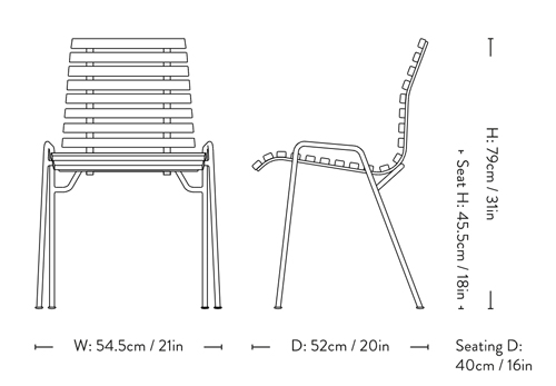 La chaise de terrasse RFH a été conçue à l'origine par Robin Day pour compléter la terrasse extérieure du Royal Festival Hall de Londres. De petite taille et de construction résolument simple, la chaise de terrasse est fabriquée à partir d'une combinaison de lattes de teck et d'un cadre en acier massif, ce qui lui confère une esthétique organique distinctive.