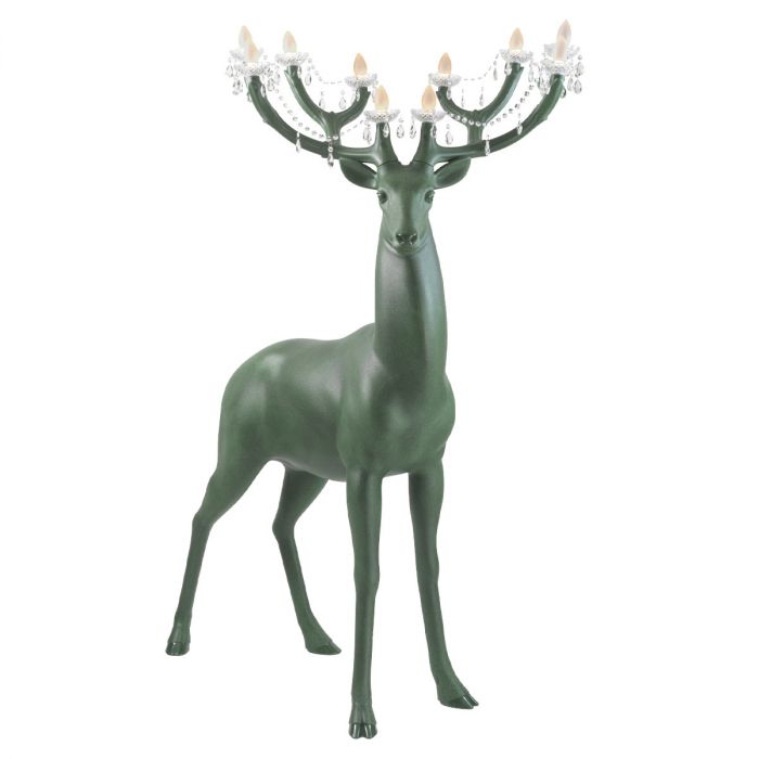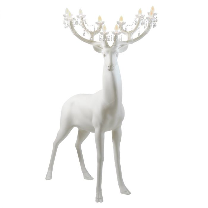 Sherwood de Qeeboo par Marcantonio. Sherwood est un impressionnant cerf de 2 mètres de haut dont les bois deviennent des lustres décorés de cristaux et de pampilles. La forte énergie naturelle de l'animal est immortalisée par Marcantonio qui imagine le cerf se déplaçant fièrement dans une forêt créant, grâce à ses puissantes cornes lumineuses, des lueurs magiques dans la nuit, comme s'il était un guide à suivre. Dans cet univers onirique entre fantaisie et réalité, Sherwood devient le protagoniste des espaces intérieurs et extérieurs.
