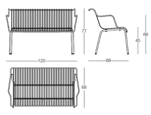 Rigueur : c’est le mot d’ordre de Konstantin Grcic, et sa nouvelle collection South, conçue pour l’extérieur mais parfaite également pour l’intérieur, en est l’emblème. En tube et en fil d’acier traité en cataphorèse et verni en polyester, elle est disponible en plusieurs couleurs : orange, bordeaux, bleu clair et bleu nuit. À la fois sinueuse et essentielle, la collection est composée d’un petit fauteuil, d’un fauteuil bas, d’un banc et d’un banc bas, tous avec accoudoirs. Elle inclut aussi quatre tables (200x120cm avec plateau de lattes de teck, 200x90, 160x90 et 90x90cm avec pleateau en tôle d’acier) et deux tables basses (120x120 cm avec plateau de lattes de teck ou pierre de lave émaillée en verre recyclé coloré et 90x90cm avec plateau en tôle d’acier). La collection est complétée par des nattes tressées pour les sieges, des tapis, des corbeilles et un plaid, tous dans le même tissu adapté à une utilisation pour l’extérieur.