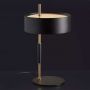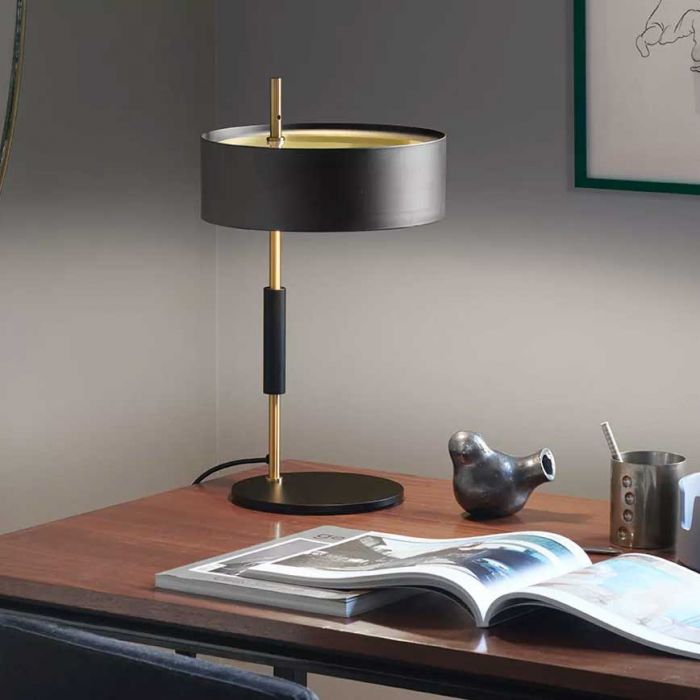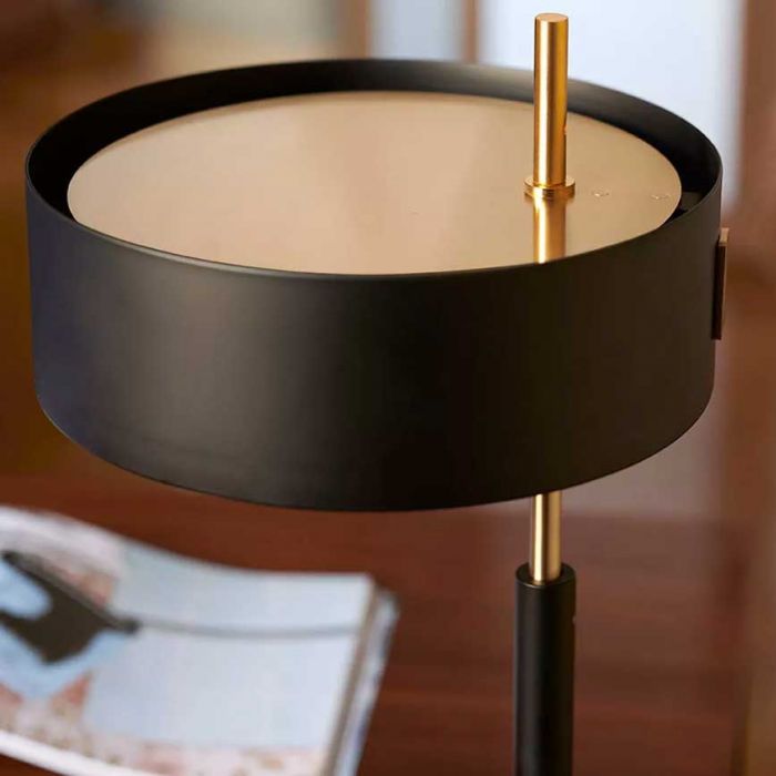 La lampe 1953 conçue par Ostuni et Forti a un design qui déplace toute la section de l'abat-jour du centre vers le côté. Ce qui rappelle avec élégance le style de ces années-là, comme l'utilisation d'un abat-jour de forme cylindrique classique et le fin contraste entre l'or satiné - la tige et l'intérieur de l'abat-jour - et le noir - l'extérieur de l'abat-jour, la base et la poignée de la tige.