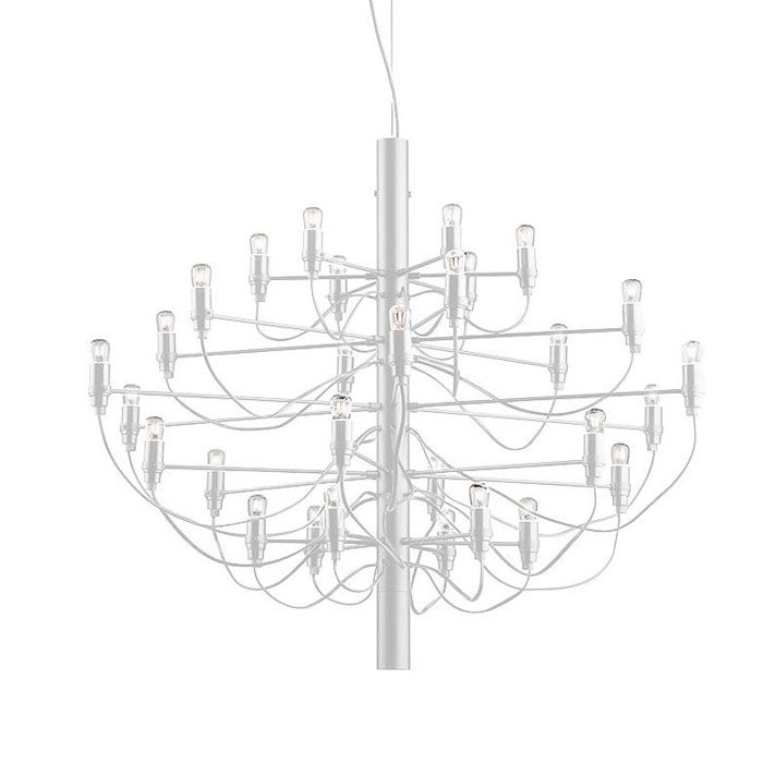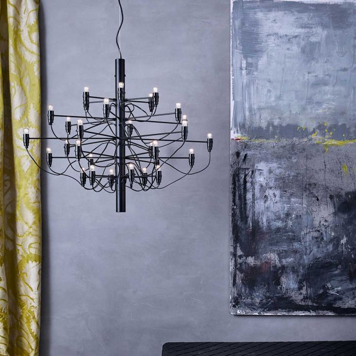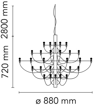Suspension 2097 de Flos, créé en en 1958 par Gino Sarfatti. 2097 est une suspension à lumière diffuse. Sa structure centrale est en fer et son bras en laiton en finition chromée. Son attache plafond et sa rosace sont en acier.