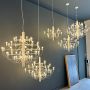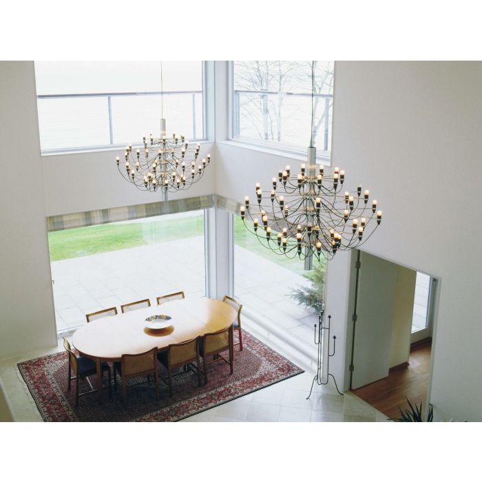 Suspension 2097 de Flos, créé en en 1958 par Gino Sarfatti. 2097 est une suspension à lumière diffuse. Sa structure centrale est en fer et son bras en laiton en finition chromée. Son attache plafond et sa rosace sont en acier.