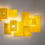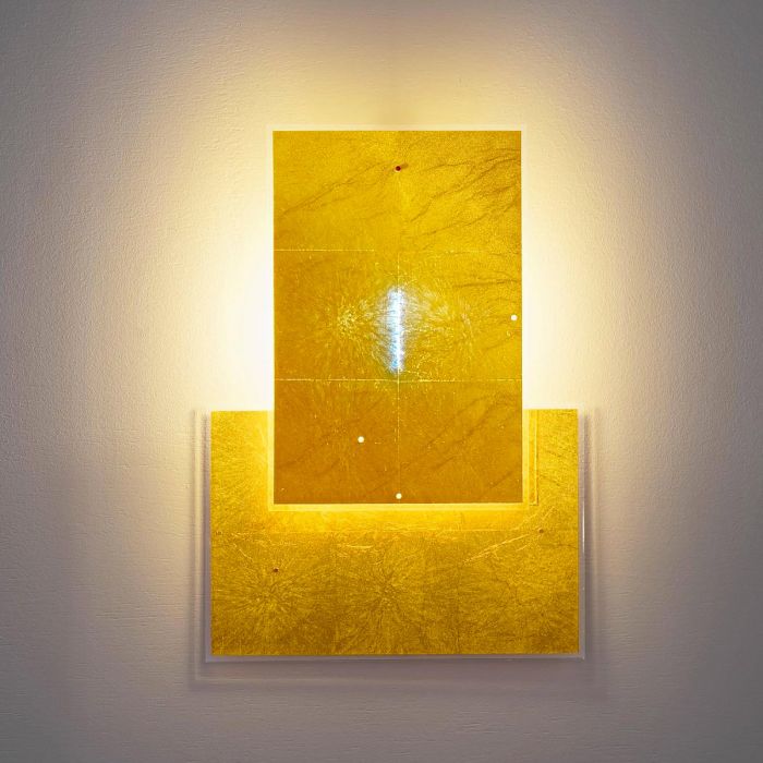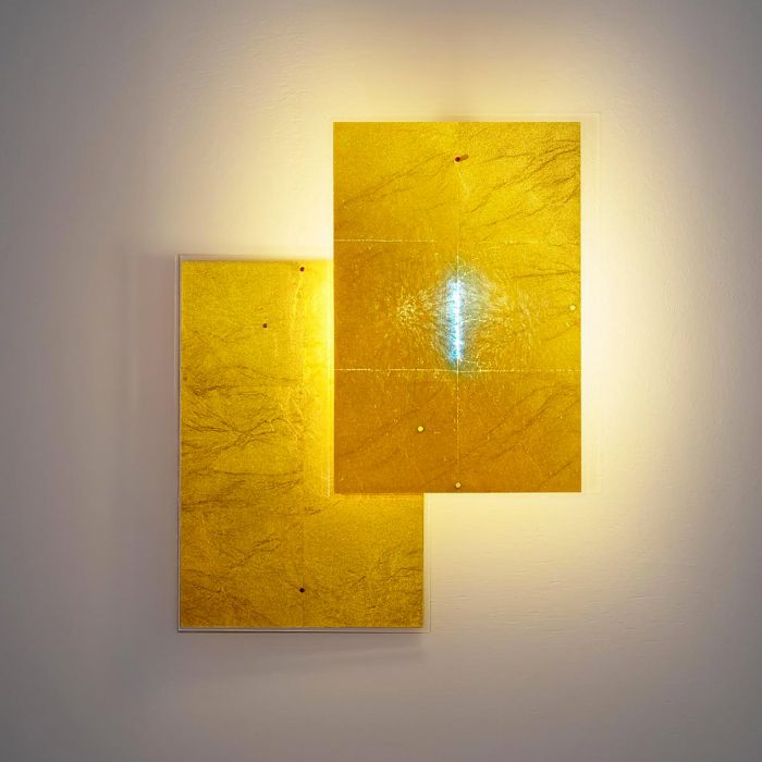 24 Karat Blau Flat est le nouveau membre de la famille Karat Blau : une applique murale fabriquée en or japonais très fin. Le principe du 24 Karat Blau Flat repose sur un panneau de verre acrylique, qui renferme une feuille d'or battu très fine et est monté à plat sur le mur devant l'illuminant. Un seul luminaire - de nombreuses possibilités : Grâce aux panneaux individuels qui peuvent être combinés à volonté et alignés de différentes manières, le client final crée sa propre œuvre d'art individuelle avec le 24 Karat Blue Flat. Battu extrêmement fin, l'or pur ne laisse passer que la lumière bleue à ondes courtes, c'est pourquoi l'illuminant apparaît bleuté. La lumière jaune d'or est reflétée par le plat 24 Karat Blau et crée une atmosphère chaleureuse dans la pièce. La lampe est l'œuvre du designer Axel Schmid, qui fait partie depuis 23 ans de l'équipe créative d'Ingo Maurer et qui a déjà développé les premiers modèles de la série.