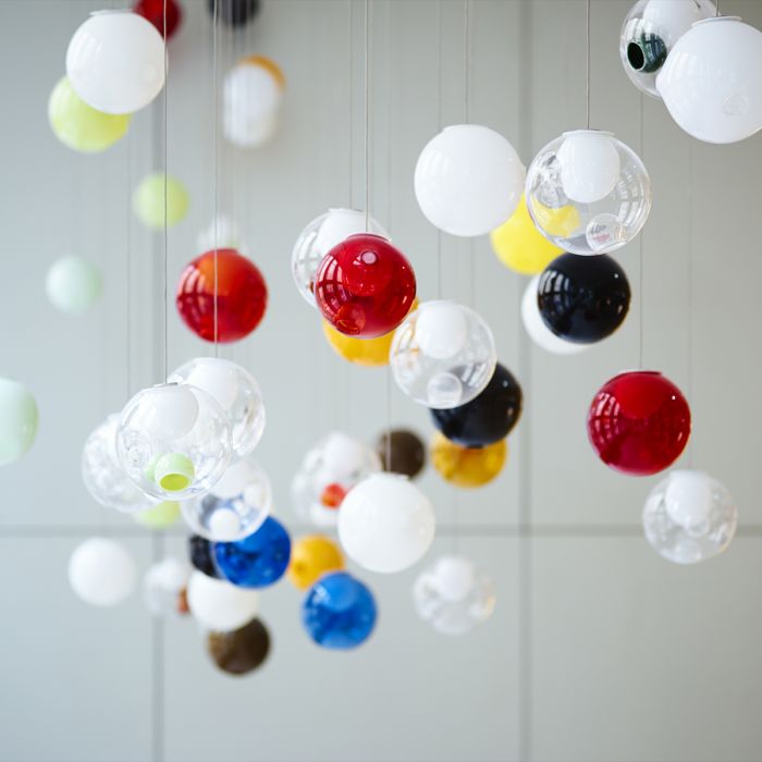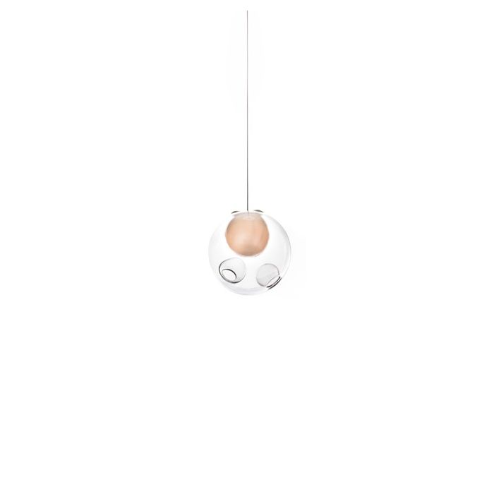 28 série est une exploration des processus de fabrication par le designer Omer Arbel. La suspension 28.1 est fabriquée à partir d'une technique de soufflage de verre complexe qui résulte dans un verre de forme sphérique claire déformée avec une collection composée de formes intérieures, dont l'un est fait de verre de lait opaque et abrite une ampoule basse tension. Une suspension élégante et design pour donner du style à votre décoration intérieure !
