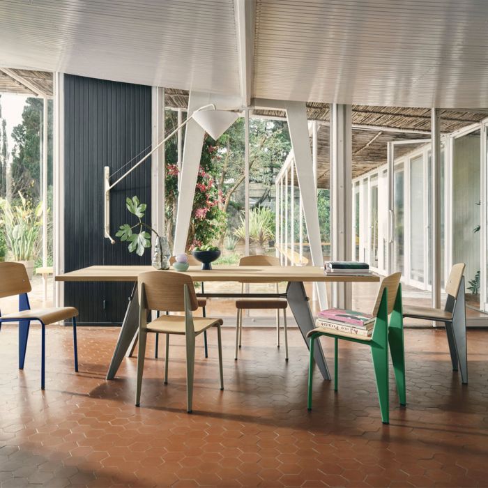 Durant les année 1940, Jean Prouvé a conçu la lampe murale Potence pour sa propre maison à Nancy : une simple ampoule fixée à une longue barre pivotante en acier, maintenue par un fil d’acier. En 1947, Prouvé a développé un abat-jour de forme conique qui s’adapte aux différentes versions et tailles de Potence. Des photos historiques de la maison de Jean Prouvé montrent qu’il a expérimenté différente types d’abat-jour, y compris des modèles conçus par d’autres créateurs.
