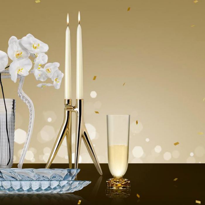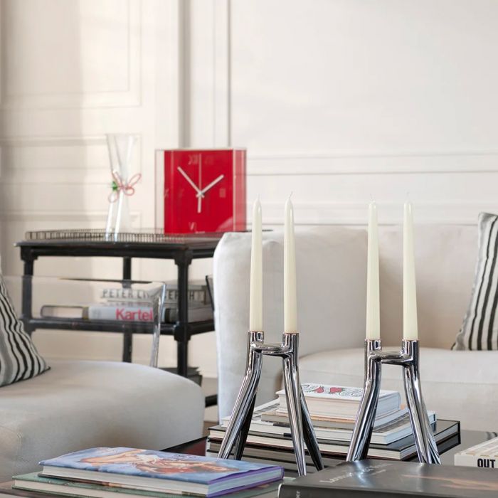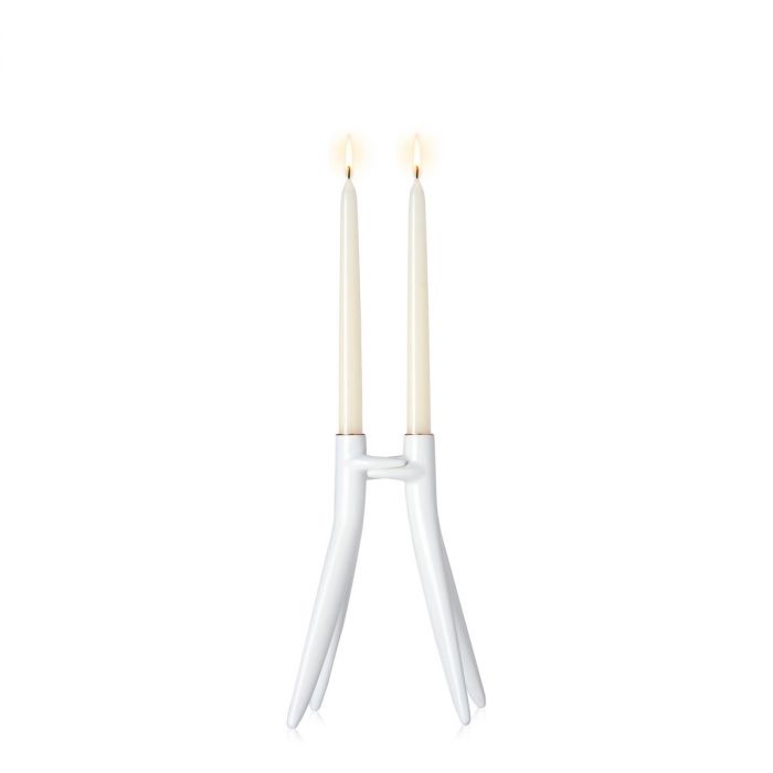 Abbracciaio représente la fusion de deux silhouettes en aluminium qui, mises l’une en face de l’autre, se transforment en une étreinte amoureuse. Les deux structures sont accrochées de manière à garantir la stabilité de l’objet. Élégant et poétique, Abbracciaio est prévu pour deux bougies. Il est réalisé en aluminium poli et décliné dans différentes couleurs.