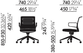 Piètement : piètement à cinq branches en aluminium injecté poli ou matière plastique (basic dark) avec roulettes doubles (Ø 60 mm). Support pivotant réglable en hauteur.