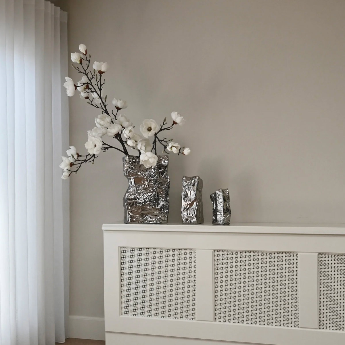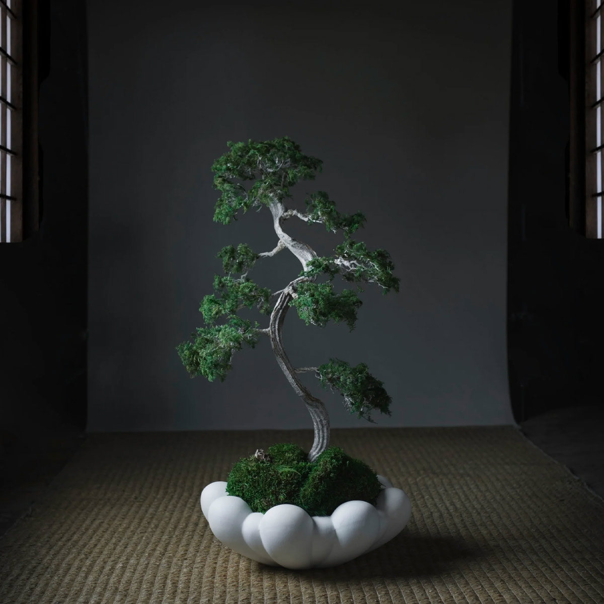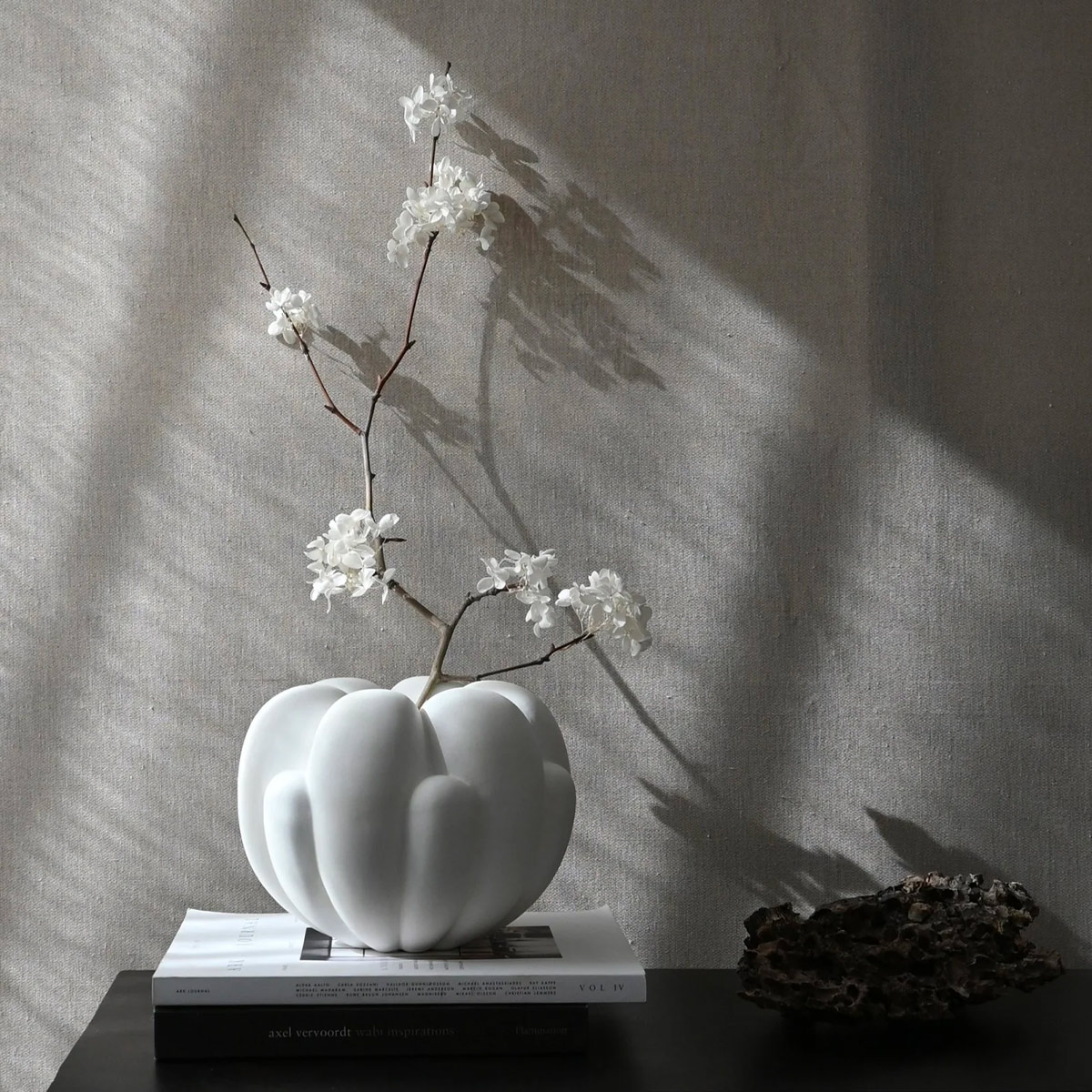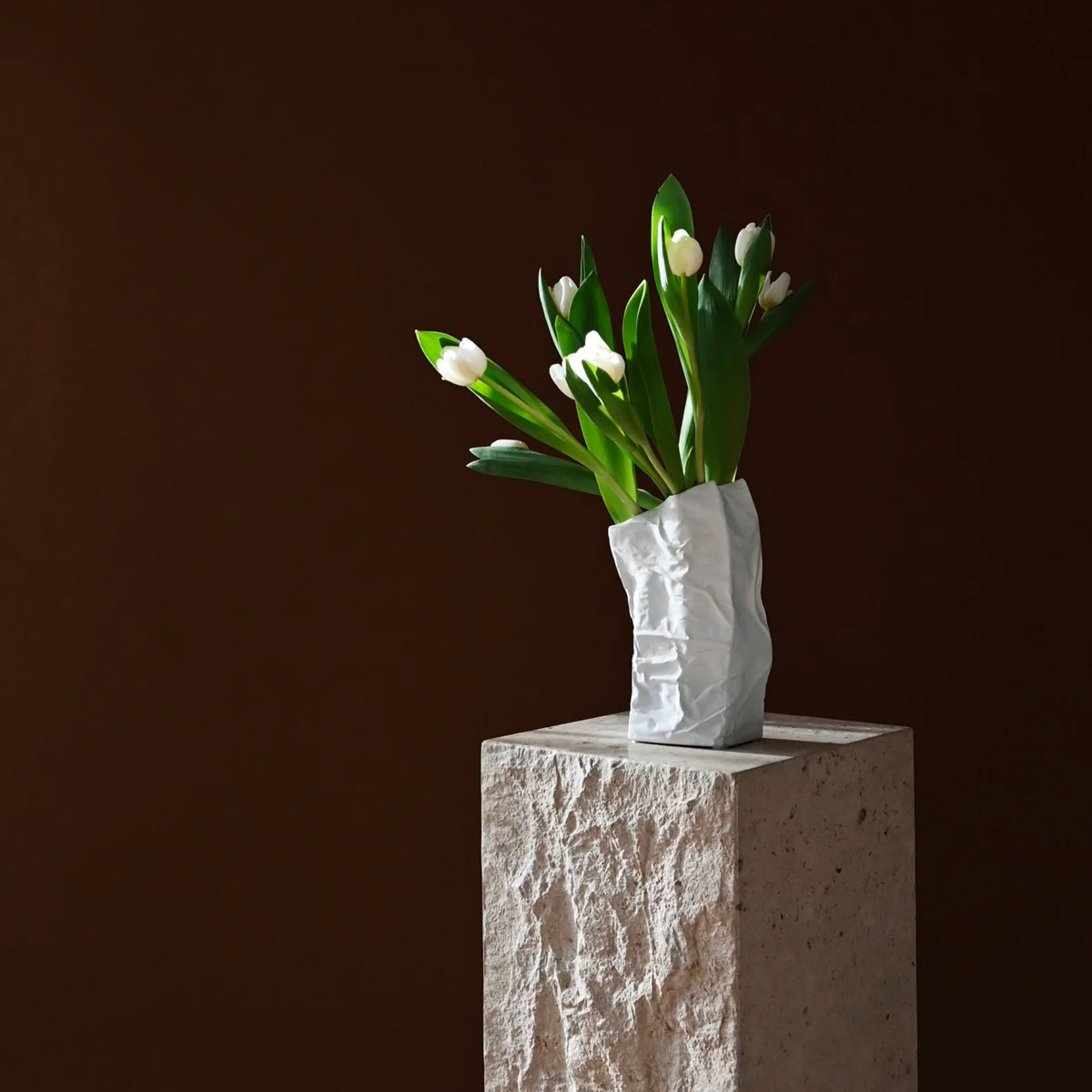 Inspiré des sacs en papier, le vase Kami met l'accent sur l'esthétique des sacs en papier froissés et impeccables. Les vases Kami ont une surface irrégulière avec des courbes et des fissures, formant la forme d'un dos en papier froissé avec des extrémités et des bords nets. Le vase met l'accent sur un beau design organique avec une touche artisanale.