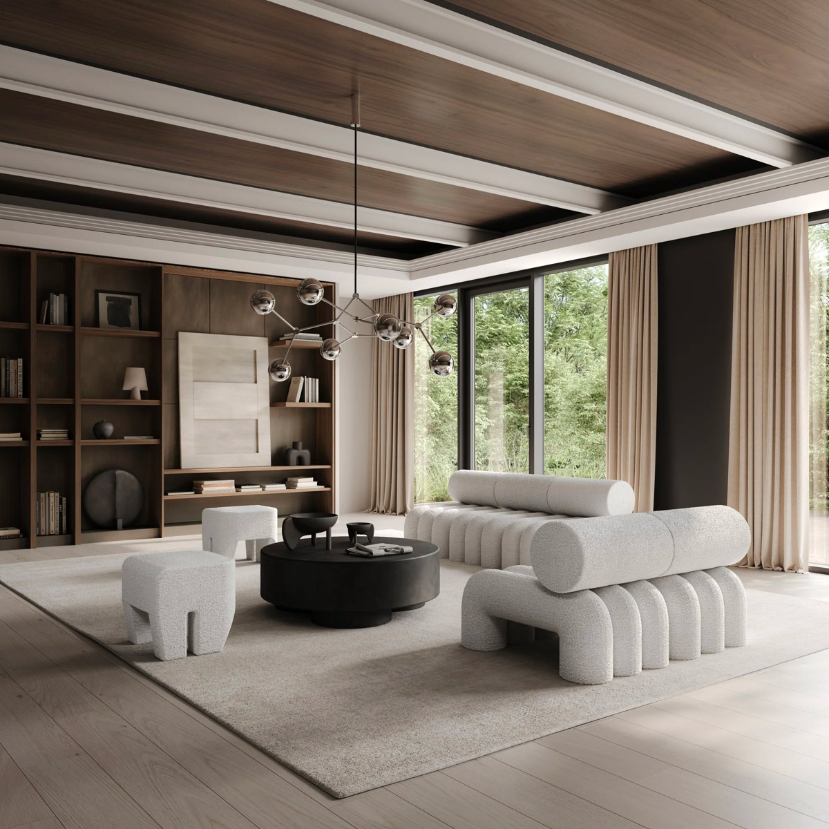 Le tabouret Sculpt s'inspire du mouvement architectural brutaliste qui a émergé dans les années 1950. Sculpt est disponible dans un luxueux tissu Bouclé blanc cassé. Le tissu Bouclé ajoute une touche chaleureuse et accueillante avec sa surface douce et tactile, complétant parfaitement le design robuste avec une touche d'élégance moderne.