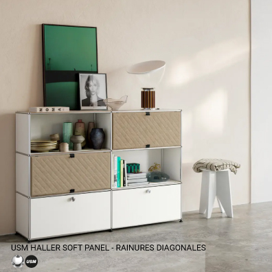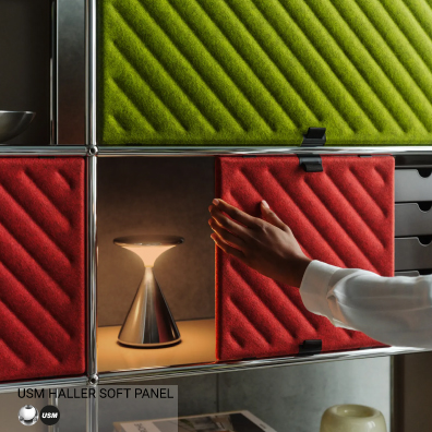 Pour supplémenter son classique, USM crée la surprise avec une nouveauté majeure : le USM Haller Soft Panel. Cet élément innovant intègre de manière ludique une texture douce et des motifs graphiques dans l’univers métallique du célèbre système de mobilier USM Haller. Grâce à leur fixation magnétique, les Soft Panels offrent aux utilisateurs une expérience totalement nouvelle de la modularité – une évolution naturelle du système à l’occasion de son 60ᵉ anniversaire. Haller Soft Panel à commander séparément pour agrémenter les meubles Usm que vous possédez déjà.