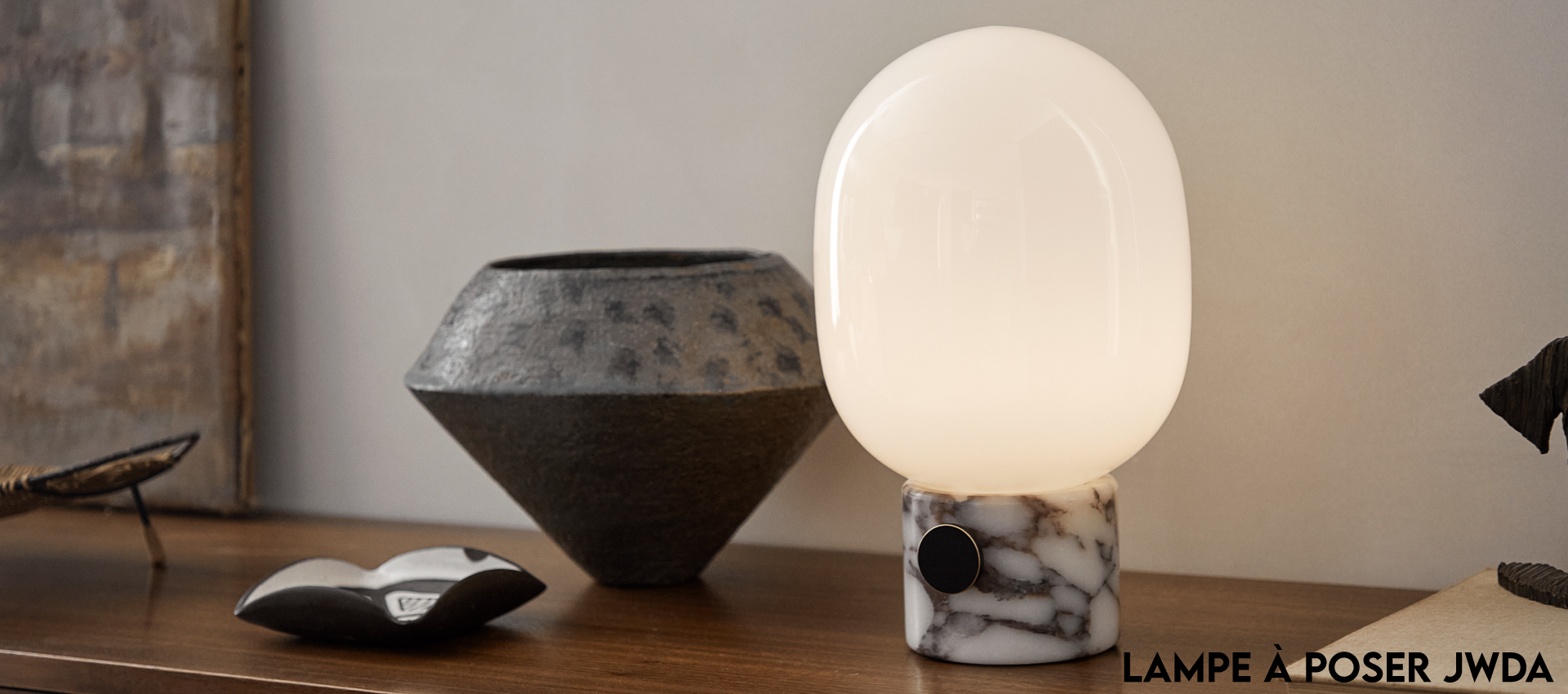Un classique instantané, la lampe JWDA est le genre de pièce sculpturale qui fait tourner les têtes et donne une nouvelle vie à une pièce. Le contraste du verre délicat et arrondi avec la base en métal robuste crée une silhouette équilibrée et intrigante. La lampe de table intemporelle JWDA est désormais disponible dans le magnifique marbre Calacatta Viola. Délivrant une lumière ambiante grâce à son abat-jour elliptique en verre opale, il repose sur une base en marbre Calacatta Viola qui présente des veines violettes saisissantes uniques à chaque pièce.