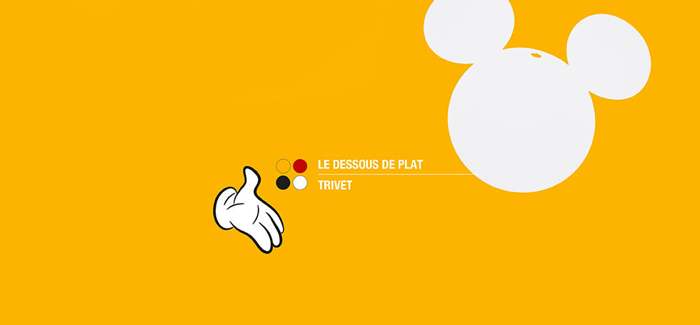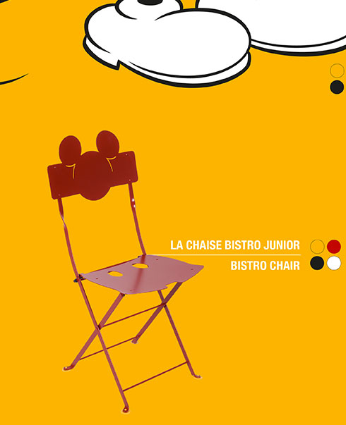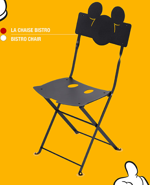 Créateur de mobilier de jardins heureux et de bonne humeur, fan de Mickey, la marque joue le jeu et s’inspire de la souris la plus célèbre de l’histoire pour détourner ses incontournables : la chaise Bistro et la lampe nomade. L’iconique silhouette de Mickey habille une chaise Bistro en version maousse pour les adultes, et mini pour les kids. Les dessous de plats mettent la plus cool des souris à table pour faire sourire petits et grands enfants, la lampe nomade toute en rondeur esquisse les trois cercles emblématiques d’un Mickey design et lumineux…