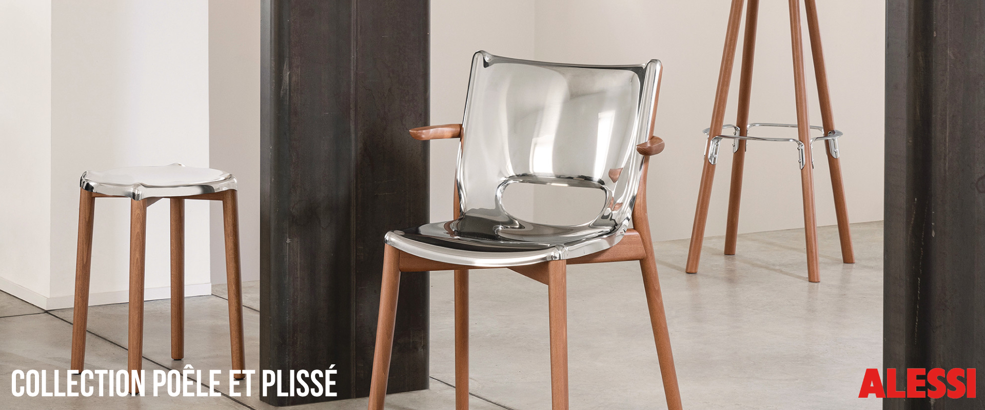 La collection de mobilier Poêle est née de l'idée quelque peu subversive et humoristique de concevoir une chaise inspirée d'une poêle à frire, tant du point de vue de la fabrication que de l'esthétique. La technologie du métal pressé à froid d'Alessi, traditionnellement utilisée pour produire des ustensiles de cuisine tels que des casseroles et des poêles, a été ré imaginée pour créer une collection de chaises, de tabourets et de porte-manteaux qui transporteront Alessi dans le monde de l'ameublement d'une manière significative. La chaise Poêle sera la pierre angulaire de la collection et devrait devenir un nouveau classique de l'industrie. Pour Alberto Alessi, il s'agit de célébrer 100 ans de travail avec le métal et plus de 30 ans de collaboration avec Philippe Starck, qu'il considère comme un prodigieux visionnaire. L'ensemble de la collection est fabriquée en Italie et constitue un nouvel exemple de la capacité d'Alessi à apporter de la poésie dans le monde de la fabrication industrielle.