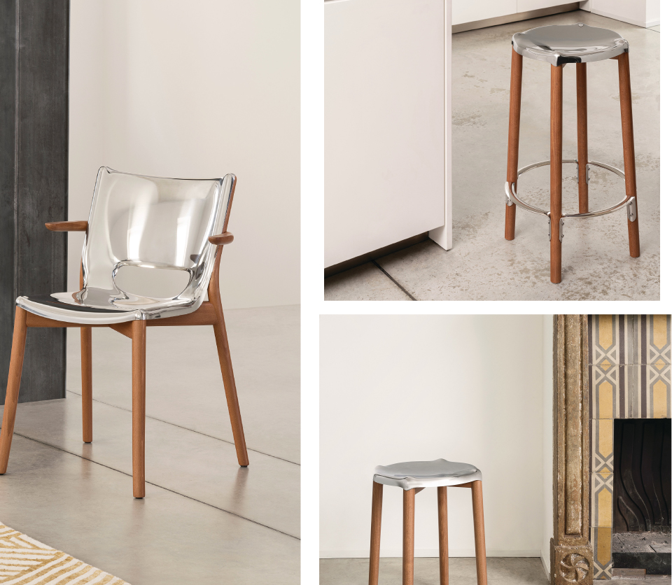 Philippe Starck conçoit une collection de petits mobilier composée de chaises, de tabourets et d’un porte-manteaux. La collection Poêle met en valeur l'habileté d'Alessi dans le travail de l'acier : la référence à "Poêle" dans le nom fait allusion à l'excellence de l'atelier mécanique de l'entreprise, qui fabrique depuis plus d'un siècle des ustensiles de table et de cuisine de la plus haute qualité depuis plus d'un siècle la meilleure qualité de vaisselle et d'ustensiles de cuisine. Ce savoir-faire s'exprime dans le travail artisanal qui caractérise les sièges de la collection Poêle, où l'élément métallique prend une texture étonnamment lisse, donnant à la tôle d'acier un aspect doux qui enveloppe harmonieusement les parties en bois. Le résultat est une série de chaises et de tabourets à l'identité forte, dont le design communique avec la légèreté formelle du porte-manteau. Une collection qui s'intègre parfaitement dans des environnements de styles différents, dans la maison ou dans des projets d'ameublement haut de gamme. Dédiée aux amoureux du design qui veulent créer des atmosphères sophistiquées et apprécier le luxe des détails formels dans les accessoires et l'ameublement. Pour les fans d'Alessi, qui peuvent découvrir l'entreprise dans un nouveau contexte domestique.