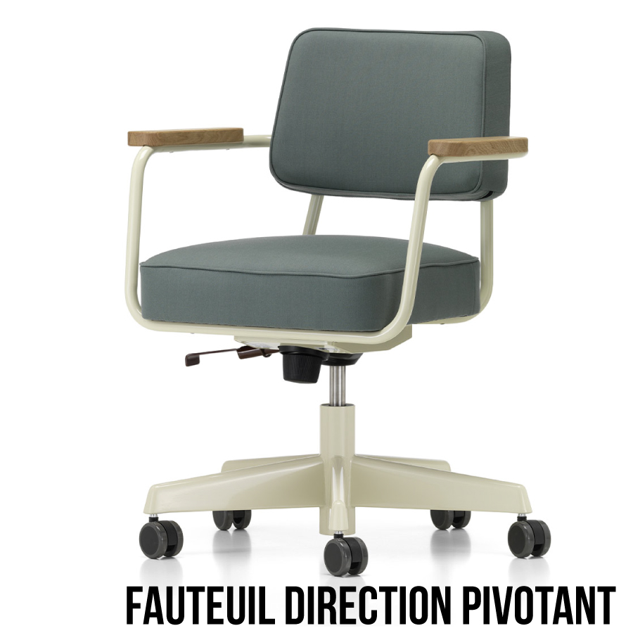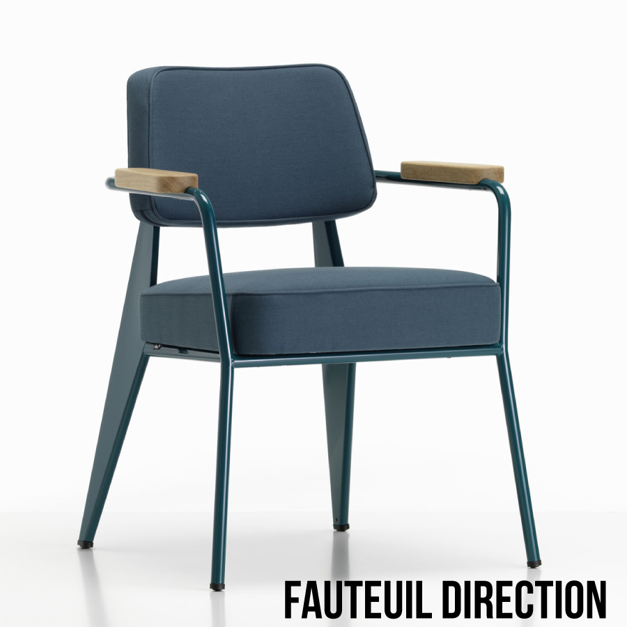 Le Fauteuil Direction est particulièrement adapté aux salles à manger ou peut servir de fauteuil dans les bureaux à domicile. Son language formel illustre les principes constructeurs caractéristiques de Jean Prouvé, basés sur des exigences structurelles.