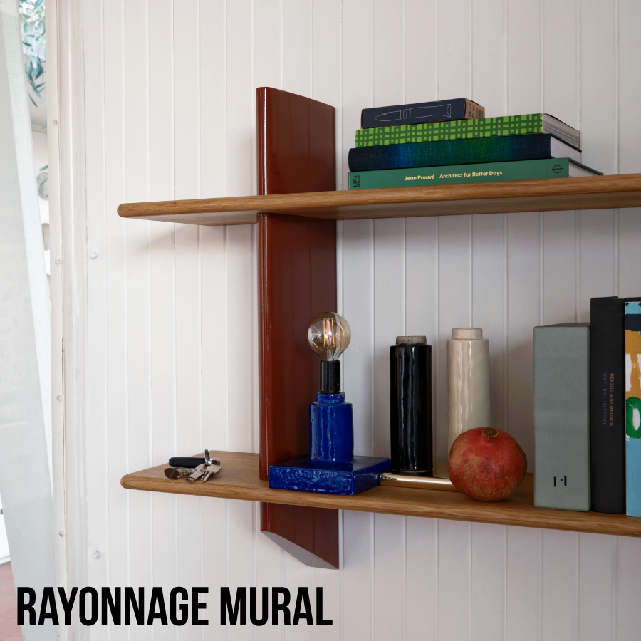 Les bibliothèques fixées au mur font partie intégrante du décor intérieur dans la première moitié du XXe siècle ; Jean Prouvé met au point plusieurs rangements de ce type tels que le Rayonnage Mural édité par Vitra, conçu en 1936 pour l’École Nationale Professionnelle de Metz. Les deux éléments verticaux du Rayonnage Mural sont en tôle pliée laquée. Leur forme effilée qui rappelle le gouvernail d’un avion ou d’un navire est un élément récurrent dans les réalisations de Jean Prouvé. Ces montants sont munis de fentes précises dans lesquelles se glissent les étagères en bois. Ces deux matériaux contrastés constituent ensemble un rayonnage fort pratique qui possède les qualités sculpturales d’un objet esthétique. Les étagères en bois sont proposées en chêne clair ou foncé, tandis que les montants métalliques existent dans une gamme de couleurs originales développées par Jean Prouvé.