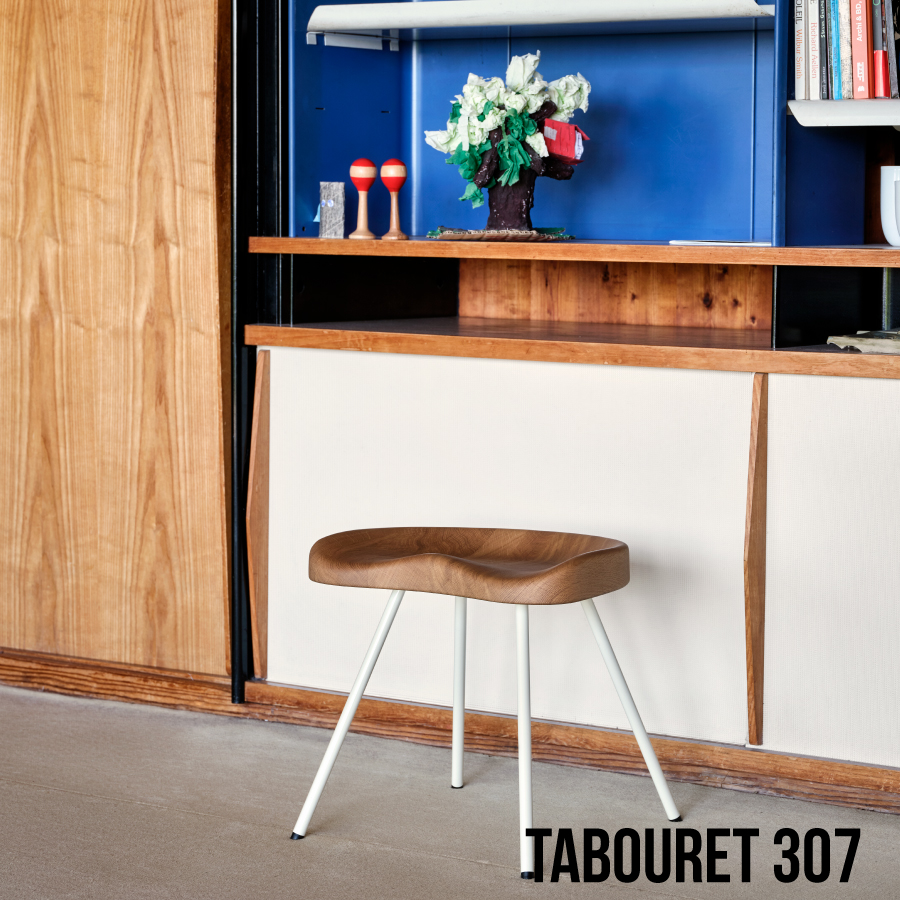 L’assise du Tabouret N° 307 a la forme d’une selle de tracteur—les trous en moins—et rappelle les sièges de l’amphithéâtre de l’Université Aix-Marseille créés par Prouvé à la même époque. A l’origine, l’assise ergonomique du Tabouret N° 307 était en tôle d’aluminium emboutie ; dans la version proposée par Vitra, elle est réalisée en chêne massif. Le rapport visuel entre la solide assise en bois et les élégants pieds en tubes d’acier engendre un contraste saisissant. Le Tabouret N° 307 existe en deux versions : assise en chêne clair/pieds Blanc Colombe ou assise en chêne foncé /pieds Deep Black.