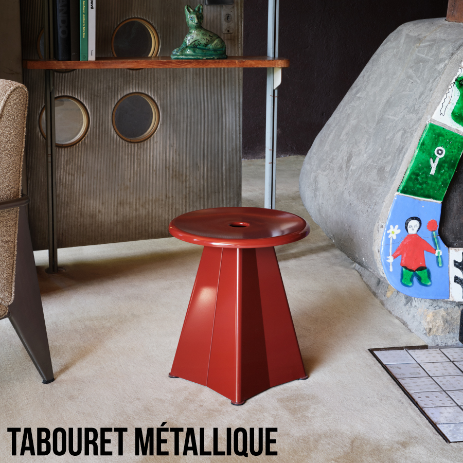 Jean Prouvé imagine le Tabouret Métallique, ainsi que deux autres propositions en métal, en 1936 pour la Maison d’éducation surveillée de Saint-Maurice. Le modèle réalisé dans ses ateliers n’est pas fabriqué en série à l’époque : aujourd’hui il est édité par Vitra pour la première fois. Le piètement en tôle pliée possède des affinités avec la table Trapèze que Prouvé crée plus tardivement. Le Tabouret Métallique est une assise pratique qui peut également servir de petite table d’appoint. Il est proposé dans plusieurs coloris Prouvé.