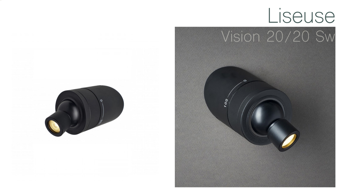 VISION 20/20 : l’outil de lecture efficace. En tête de lit ou près d’un canapé, Vision 20/20 a été développé pour obtenir le maximum de netteté en réglant la puissance de la lumière et ce, avec un grand angle de rotation. Cet objectif permet de lire confortablement sans fatiguer la vue. Son dessin est direct, sans fioriture : outil de lecture. Les lampes possèdent deux sources lumineuses, celle du bas est rotative.