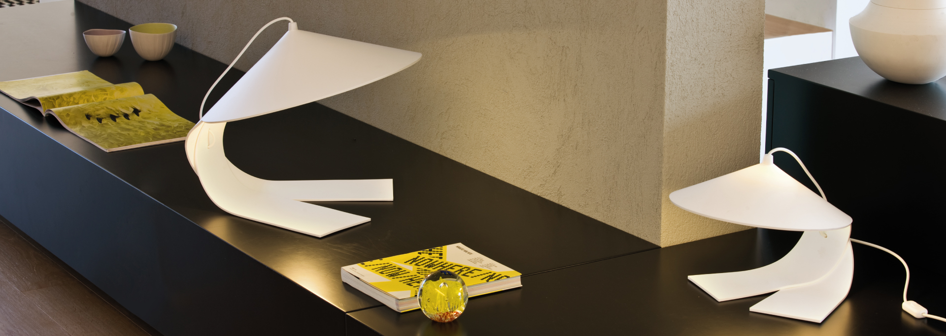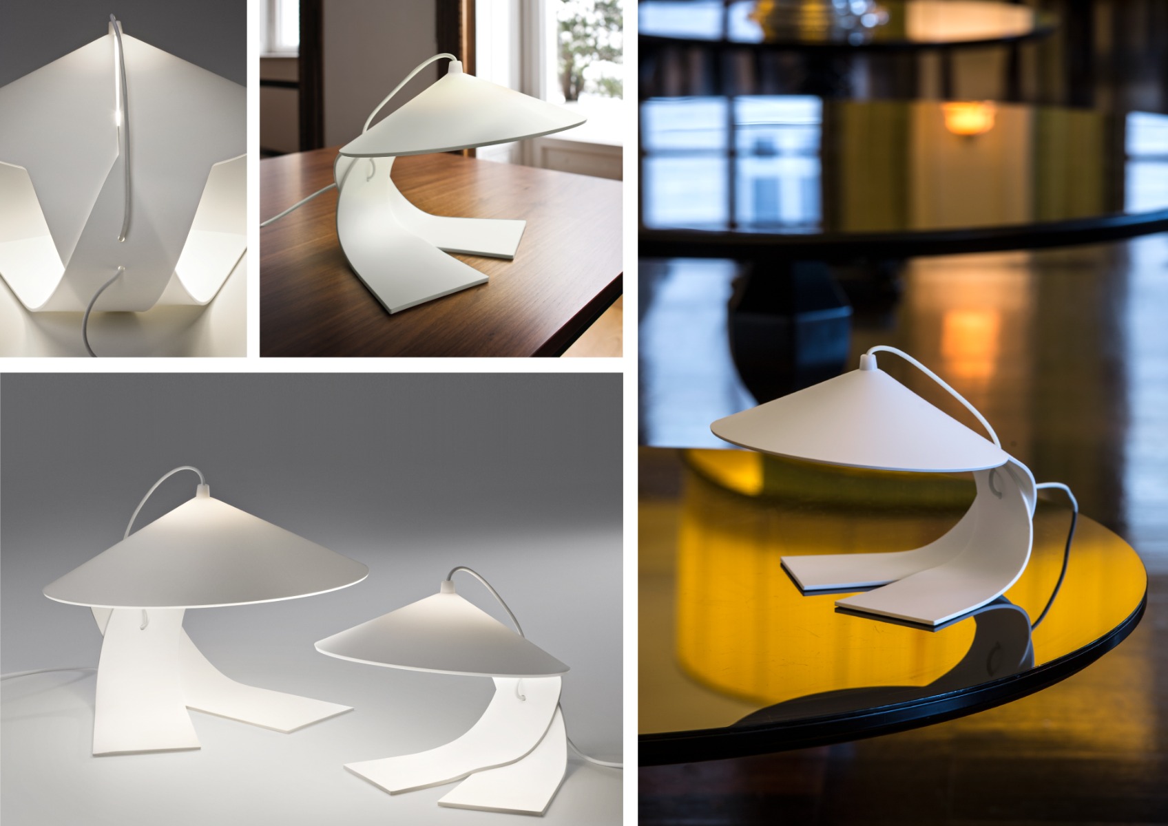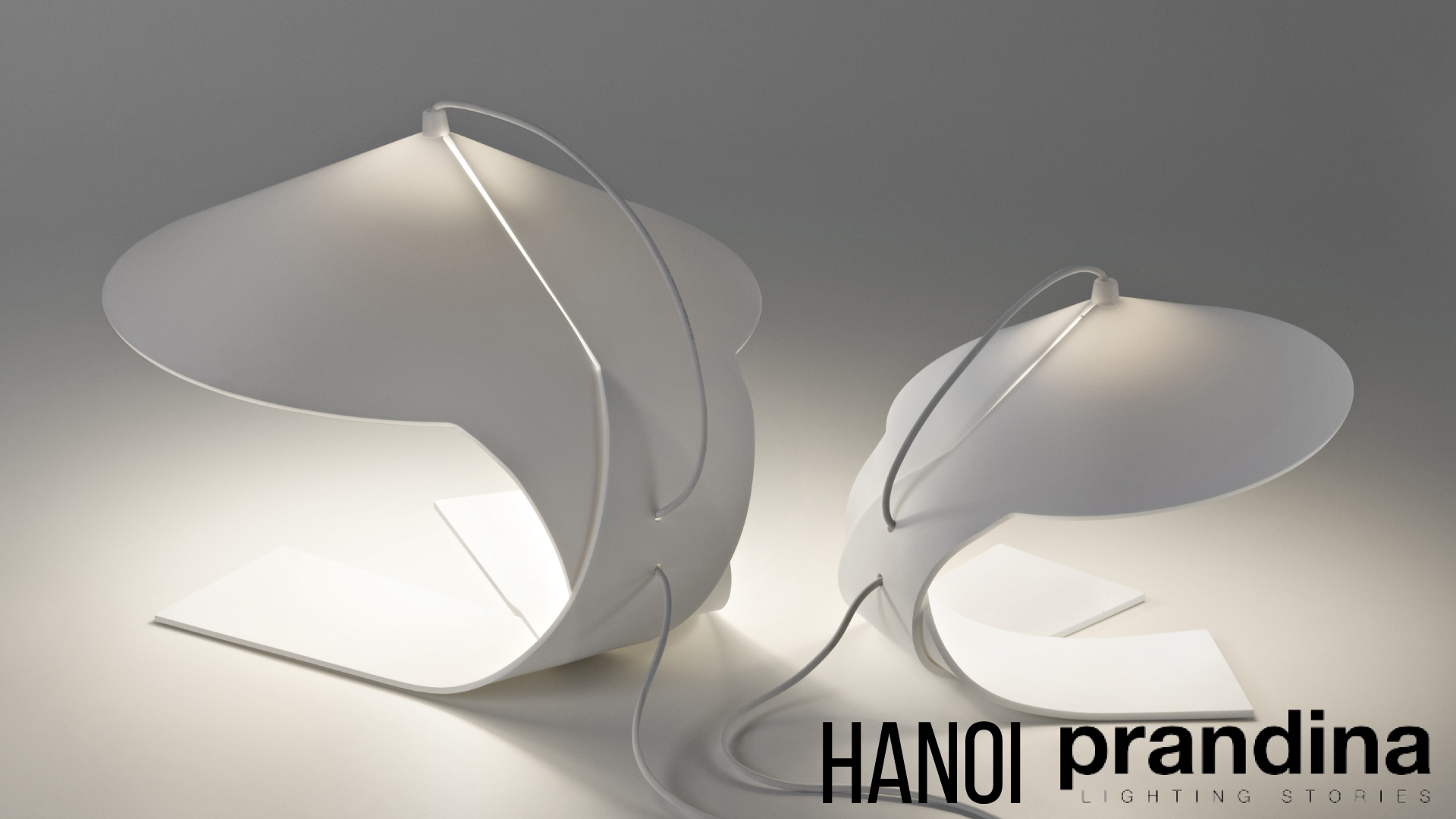 La lampe à poser Hanoi incarne pleinement la grâce délicate d'un origami. Basé sur un concept exécutif très simple, une seule feuille qui acquiert tridimensionnalité et volume, il prend une forme bien équilibrée qui rappelle les grands chapeaux de paille typiques des populations orientales. Complètement blanche, décorative et en même temps essentielle, Hanoi se définit par une cohérence formelle qui se confirme dans chaque détail, offrant une lumière douce et tendre, comme le geste de s'incliner pour saluer. Fabriqué en méthacrylate opale, et disponible en deux dimensions, il dirige sa lumière vers le bas, éclairant et créant une alternance de surfaces opaques et réfléchissantes.