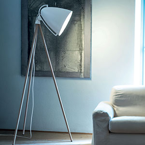 GILDA Créé par le designer et architecte Enrico Franzolini en 1997, Gilda se distingue par son grand abat-jour en tissu, suspendu sur un trépied réglable et inspiré par les outils professionnels du photographe.