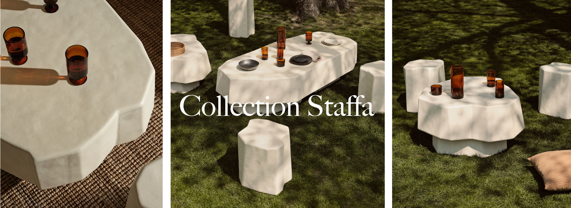 Inspirée des formations rocheuses volcaniques uniques de l’île ancienne de Staffa en Écosse, la collection Staffa se compose d’une série de meubles audacieux. Ce nom, qui signifie pilier en vieux norrois, est un hommage à chaque pièce, entièrement réalisée en béton renforcé de fibres de verre, au moyen d’un procédé de moulage innovant qui lui confère une forme brute et irrégulière rappelant des blocs de pierre taillée. Adaptée à une utilisation intérieure et extérieure, la table basse Staffa est une pièce intrigante qui brouille la frontière entre art et fonctionnalité. Placez cette pièce contemporaine au centre de votre salon ou de votre coin salon extérieur et regardez-la susciter naturellement la conversation.