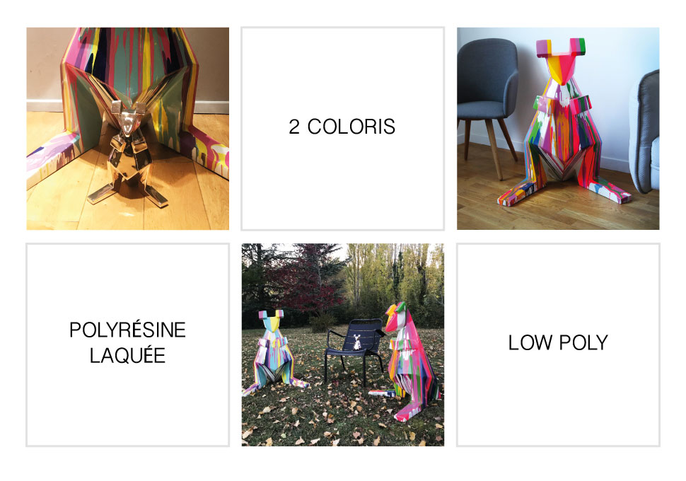 Kangy, savant mélange d’art contemporain et de design industriel imaginé par l'artiste SJ. Animal, emblème de l’Australie, laissez-le vous transporter aux pays des aborigènes. Puissant animal, parcourant des kilomètres en bondissant et excellent boxeur, cette création originale dynamise parfaitement tout votre intérieur. Décliné en plusieurs coloris, sautez-le pas dans l’univers pop.