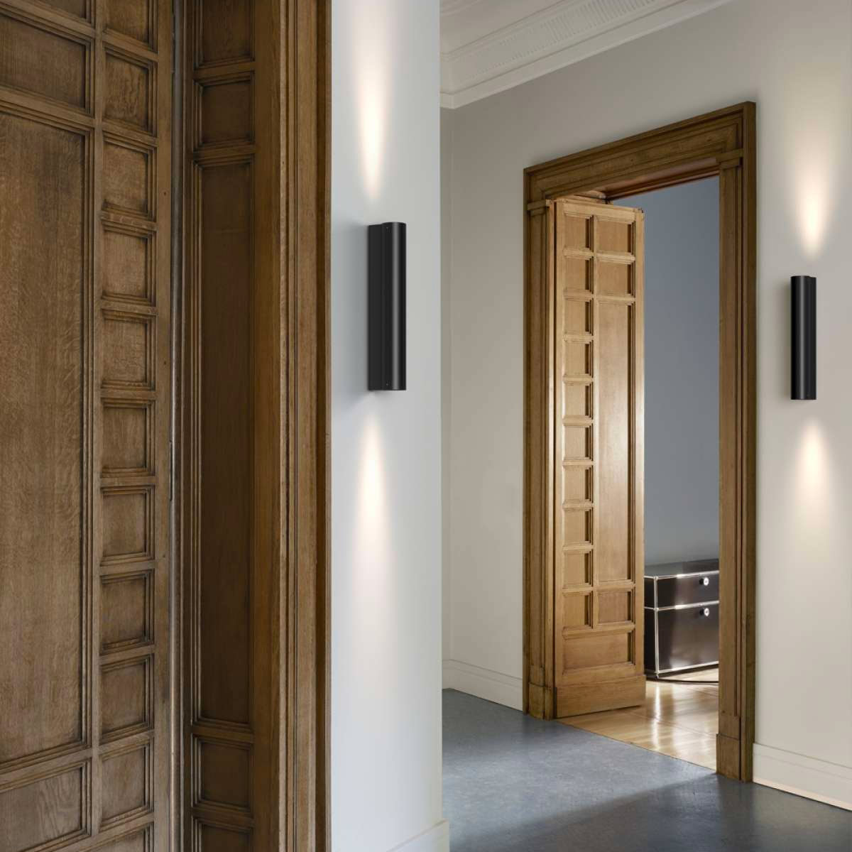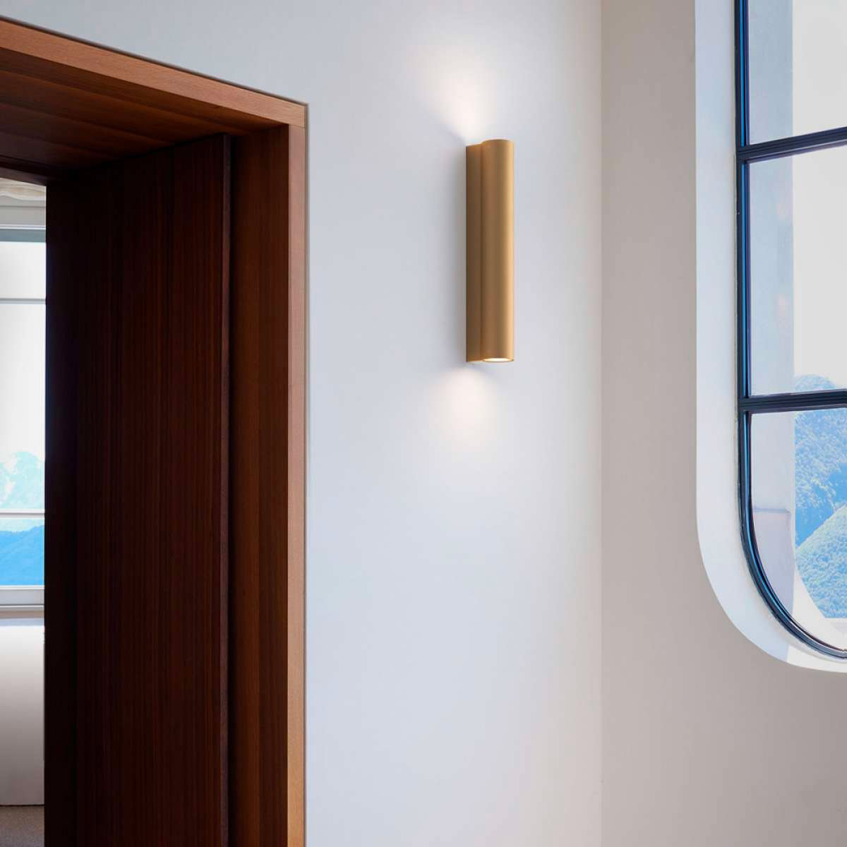 Appliques murales pour l'intérieur. Le corps cylindrique se connecte en douceur aux surfaces architecturales. L'optique permet une large gamme de solutions d'éclairage pour de multiples contextes.