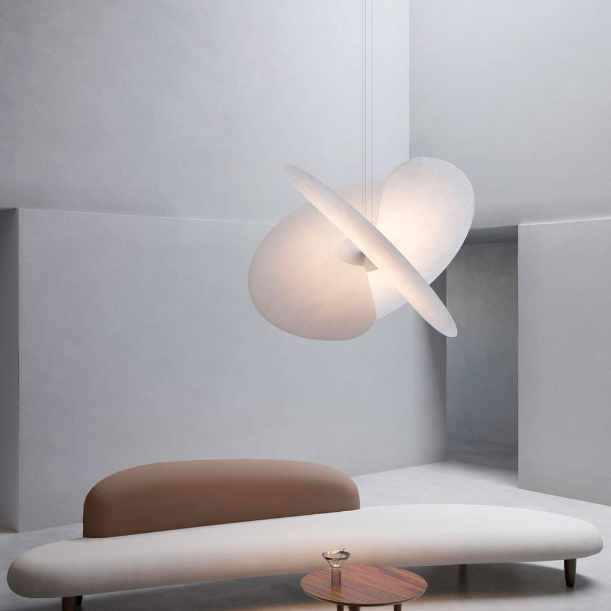 Un lustre de grand impact émotionnel, basé sur l'intuition créative du designer, ainsi que sur la recherche sur les matériaux, la technologie et le design menée par di Luceplan. Un nouveau protagoniste pour les espaces de vie de la maison, mais aussi pour les applications contract. La taille est impressionnante, mais l'image globale est éthérée, comme un organisme flottant dans l'espace. Levante (le nom suggère légèreté et vent, mais aussi une référence claire à l'esthétique orientale) découle de l'intersection de trois grands éventails, réalisés dans un matériau sans précédent pour le secteur du design, emprunté au monde de l'alimentation, avec un aspect similaire au riz papier, pour diffuser la lumière de manière uniforme sur les surfaces. L'épaisseur des voiles est minime et ils sont attachés avec des aimants au noyau central qui contient la source lumineuse, cachée comme s'il s'agissait d'un cœur organique battant.
