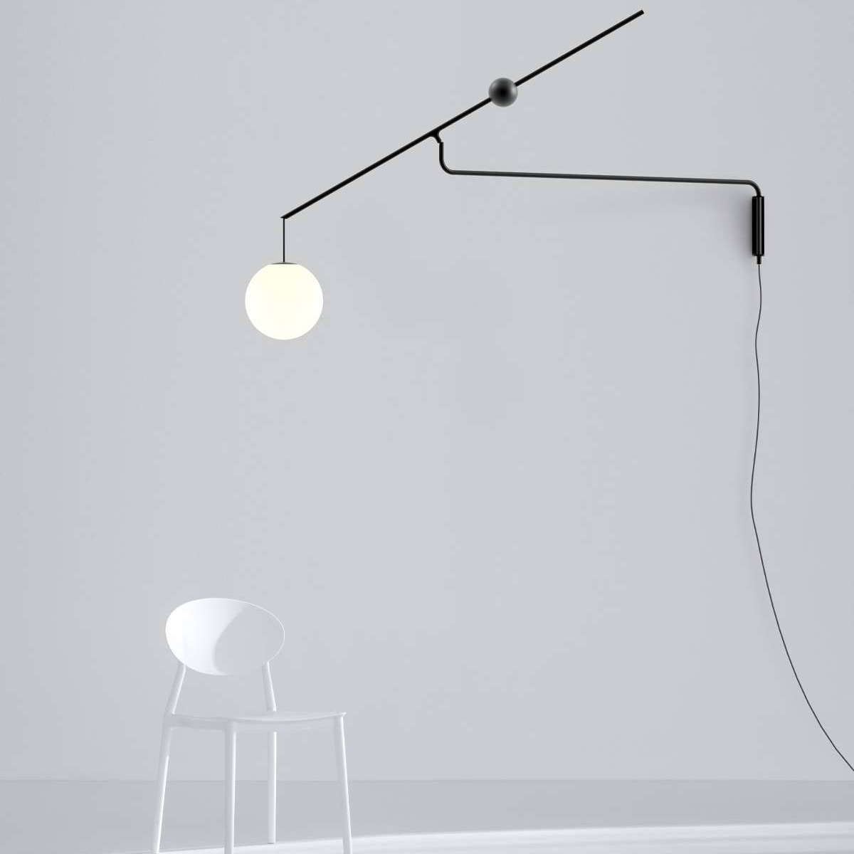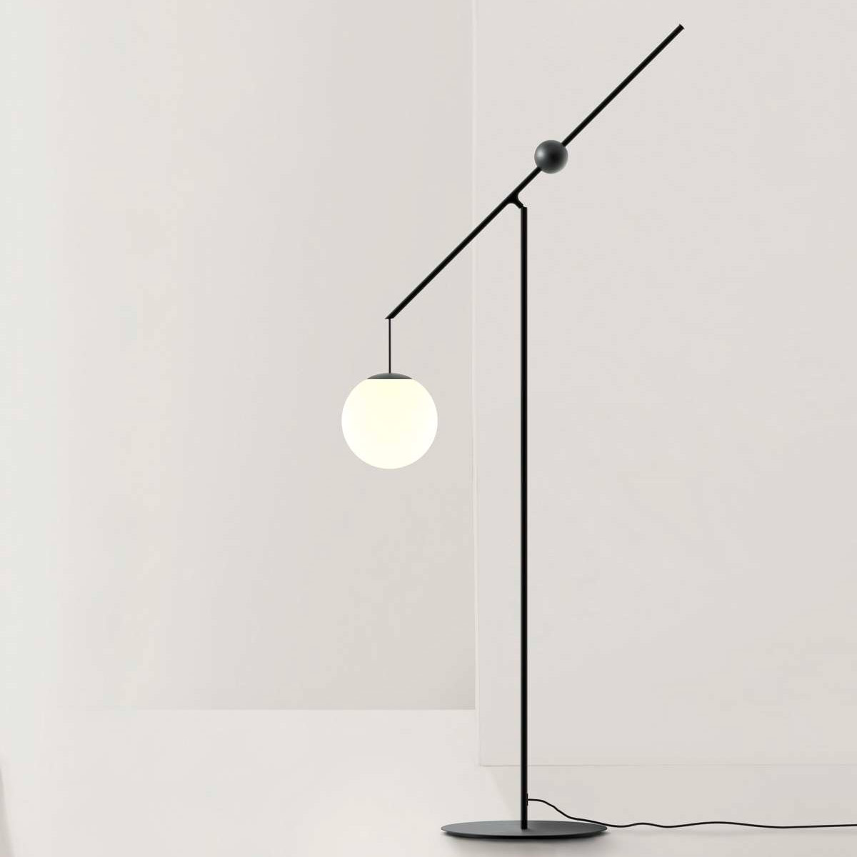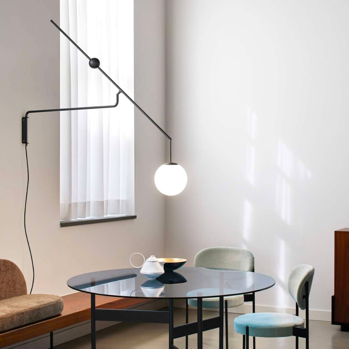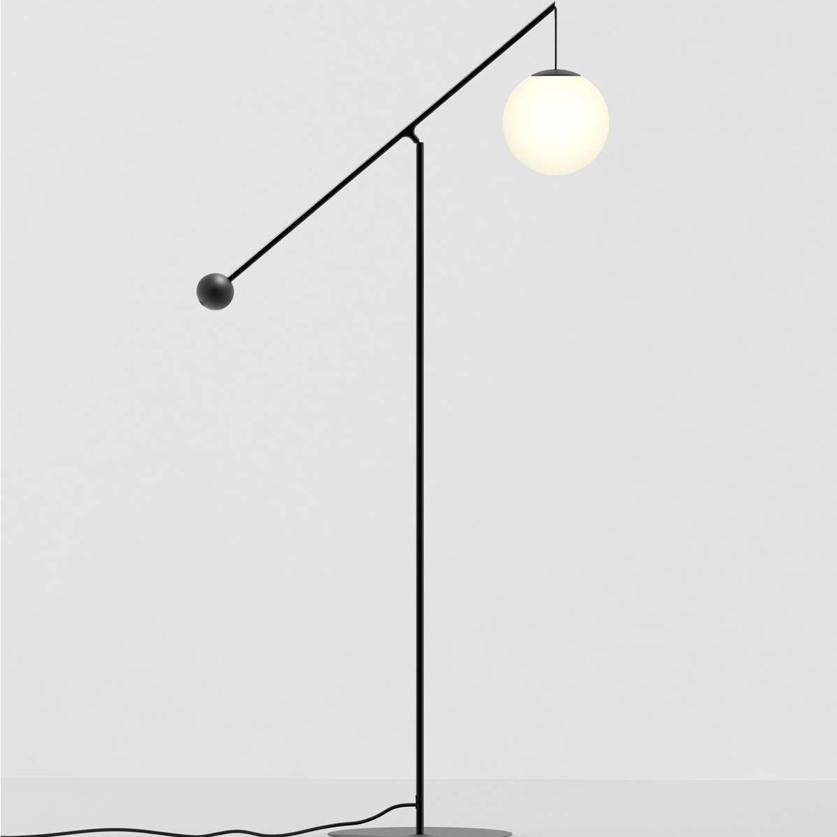 Le lampadaire prend différentes positions grâce à l'utilisation d'un contrepoids, en appuyant sur le bouton au-dessus de la sphère, un ressort est relâché et le contrepoids est libre de glisser sur la vapeur, permettant de changer la position du diffuseur de haut en bas.