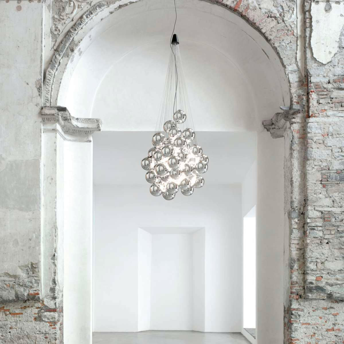 Composé de sphères de verre à différentes hauteurs, Stochastic se prête à des combinaisons infinies dans une sorte de liberté maîtrisée : chaque sphère est reliée à de petites tiges d'acier de différentes longueurs qui peuvent être fixées à la structure selon vos propres impulsions créatives. La source lumineuse - un double module LED à haut rendement - est enfermée dans les sphères, générant une lumière indirecte chaude dirigée vers le haut et vers le bas.