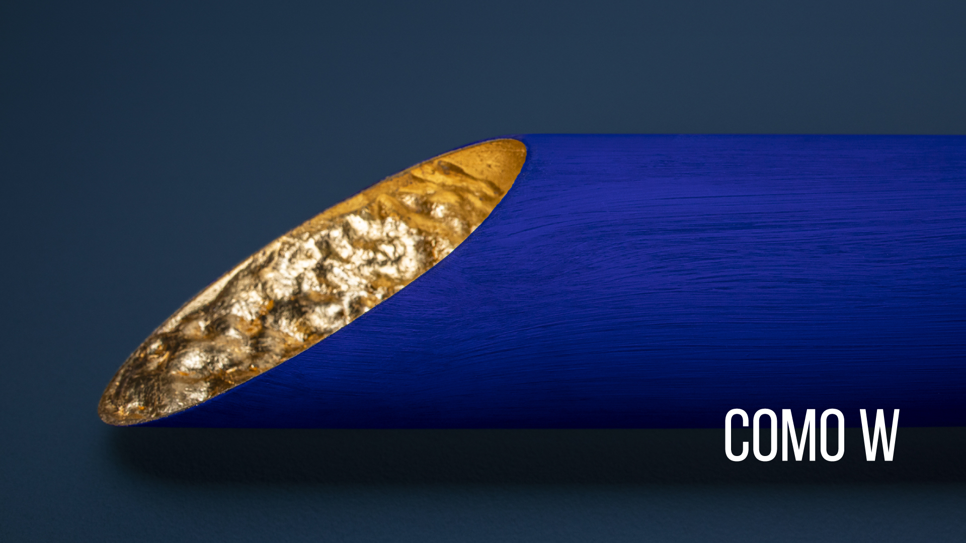 Plus qu’une lampe, une sculpture lumineuse. Le nouveau modèle Cono W, comme son nom l’indique, présente une élégante structure tubulaire avec une forme conique distinctive, qui caractérise l’esthétique de cette applique. La finition de Cono W est, comme toujours, réalisée à la main et combine une nuance lumineuse de bleu – appliquée avec des coups de pinceau irréguliers pour donner un aspect texturé à la surface extérieure de la lampe – avec la préciosité de la feuille d’or qui recouvre l’intérieur.