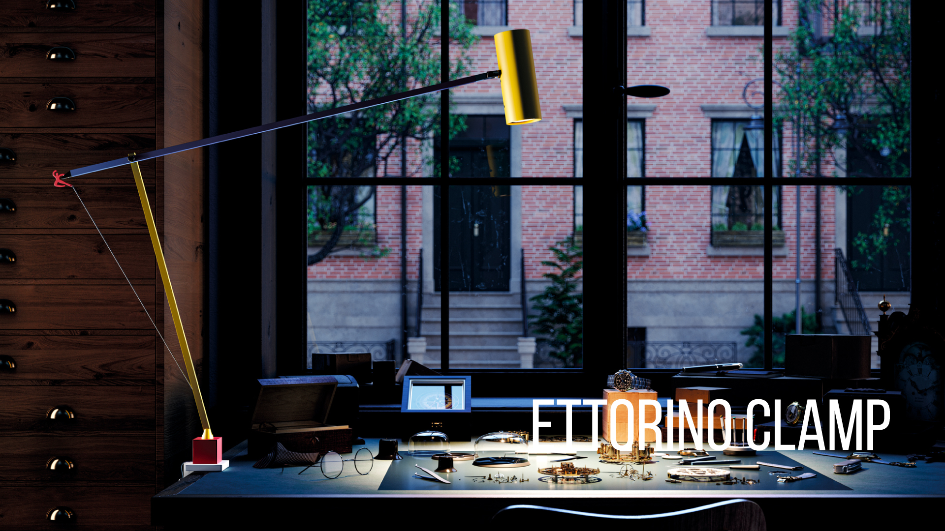 Ettorino Clamp, est conçue comme une lampe de bureau adapte aux surface d’une épaisseur maximale de 5,5 cm, est conçue comme une lampe de bureau, pour fournir un éclairage approprié sur le plan de travail, grâce à la possibilité de mouvement et de rotation de la lampe.