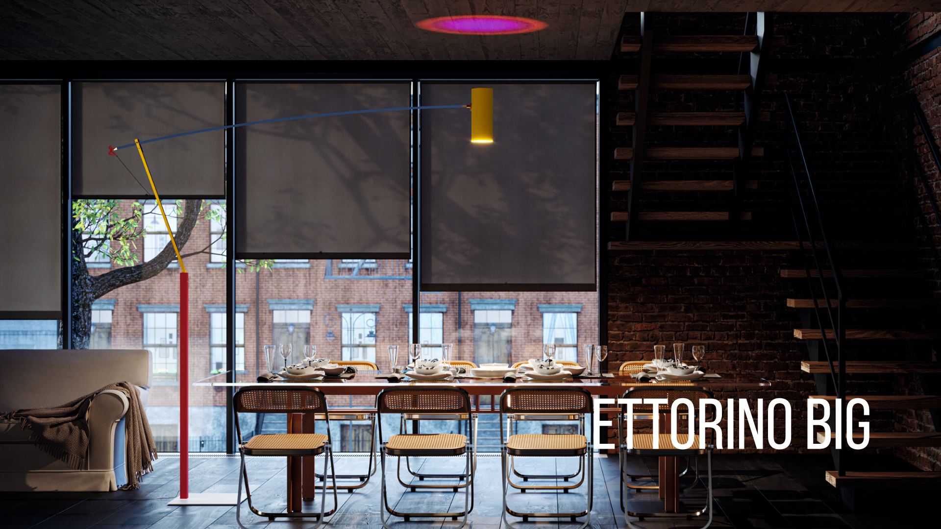 Ettorino BIG est un lampadaire de grande taille. Il est conçu pour éclairer un salon ou une longue table, grâce à une DEL COB 15W combiné avec une optique très large qui distribue la lumière uniformément sur la surface en dessous.