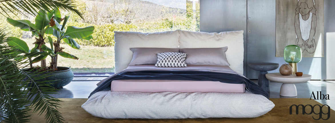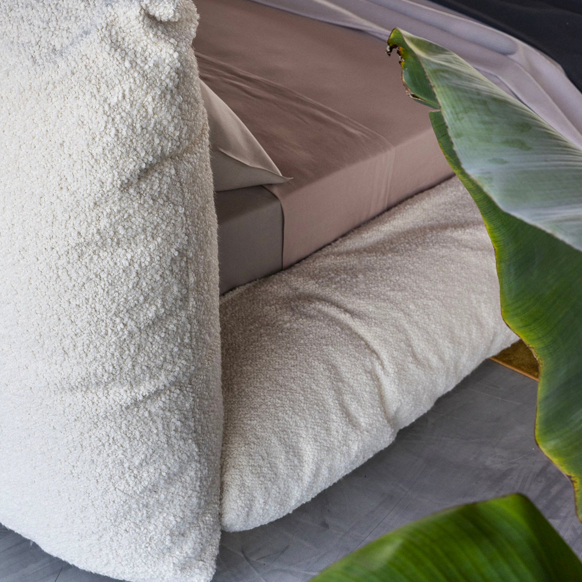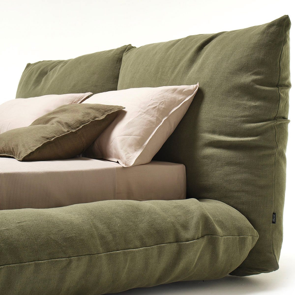 Lit double avec coque rembourrée caractérisé par des lignes douces, de grands volumes confortables et rassurants. Protagoniste incontesté de la zone nuit. L'extrême simplification de l'élément lit, les coussins, généralement des accessoires, deviennent des éléments porteurs acquérant des formes et des plis uniques avec continuité et harmonie.