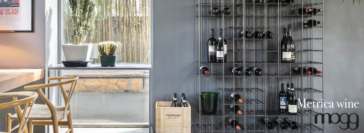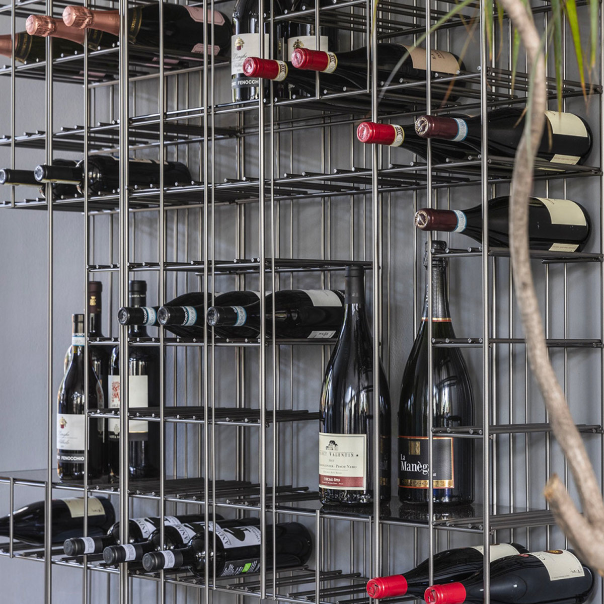 La cave Metrica est un porte-bouteilles en métal avec une structure simple dont le rythme est marqué par des tiges de fer fixées à différents intervalles à l'intérieur desquelles bouteilles et objets complètent la forme en écrivant de nouvelles compositions de temps en temps.