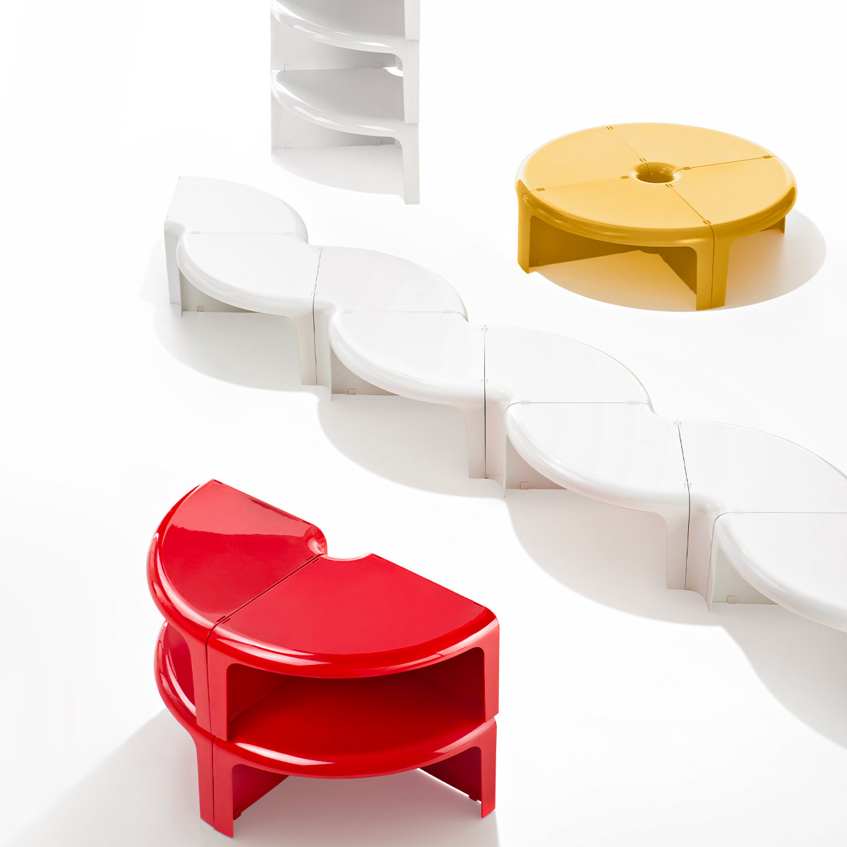 De la planche à dessin de Rodolfo Bonetto en 1969, 4/4 représente le produit multifonctionnel typique qui peut facilement s'adapter à l'environnement et à l'utilisation, permettant ainsi des interprétations continuellement nouvelles des espaces dans lesquels nous vivons. Lignes courbes, plastique brillant et emboîtement facile transforment les quatre éléments qui la composent en une table basse ronde, une table serpentine, une bibliothèque modulable ou encore une étagère d'angle. Fabriqué en plastique ABS moulé par injection, 4/4 est une solution astucieuse pour la maison, le bureau ou les salles d'attente. Pour les amateurs de ce genre de genre, il apparaît avec Sean Connery dans le film 007 "Diamonds are Forever".