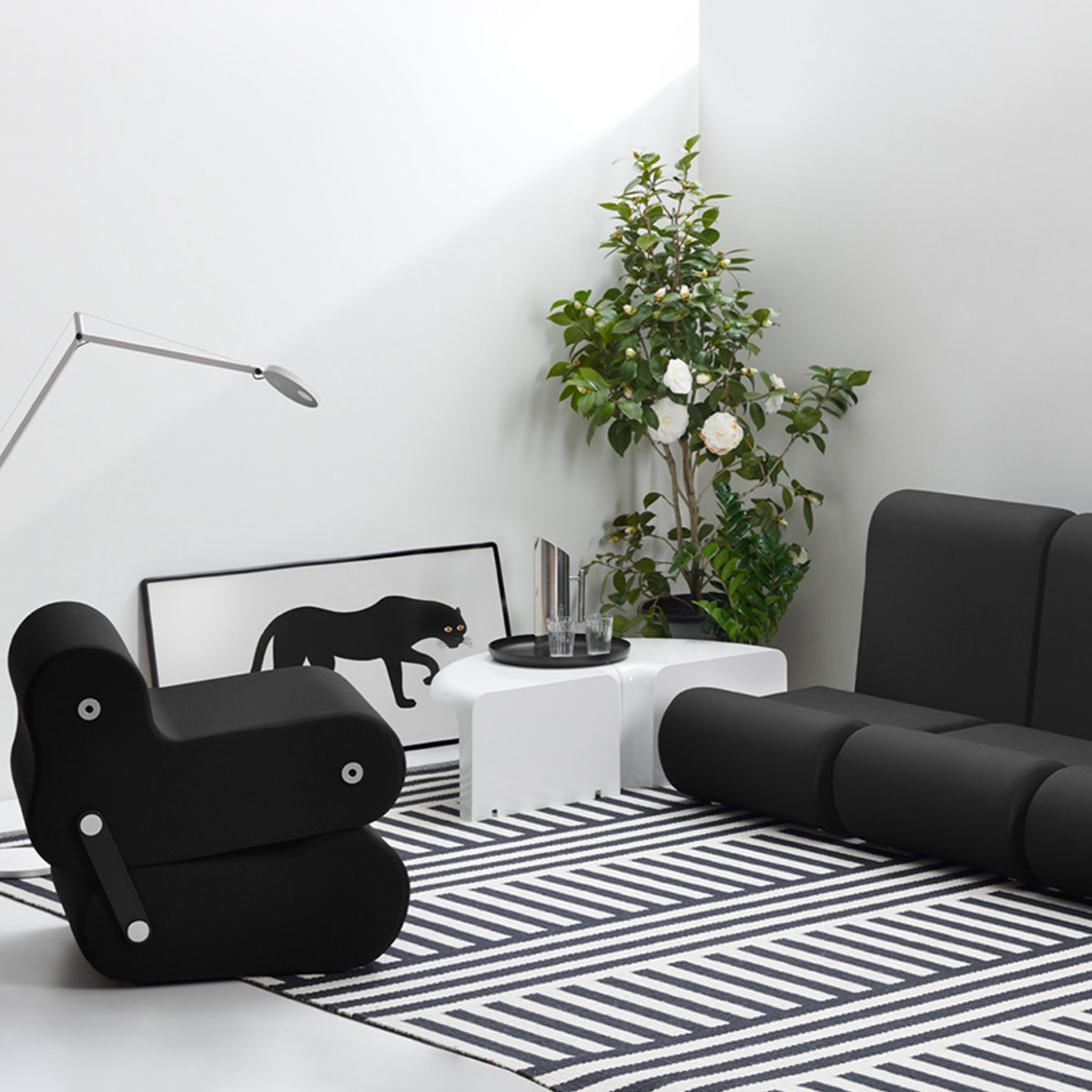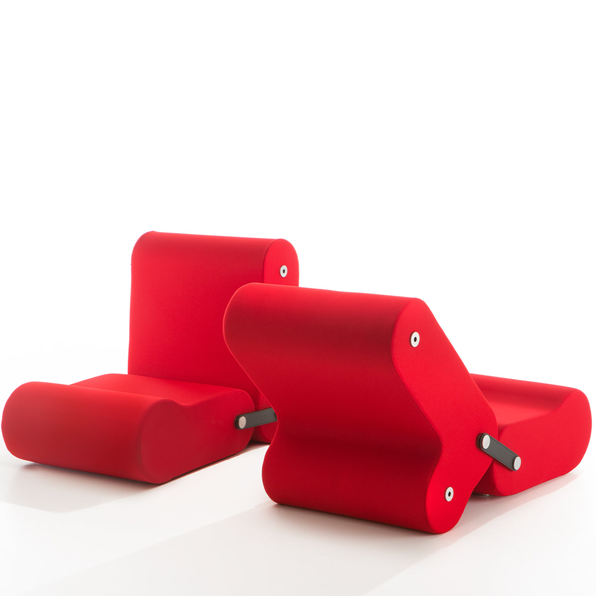 Multichair est un système convertible composé de deux éléments individuels qui peuvent facilement se transformer en chaise de conversation/relaxation. Il s'agit d'un produit conçu avec toute l'attention et le respect que mérite une véritable icône du design. Les deux coussins ont une structure interne en acier et sont recouverts de mousse de polyuréthane. Sur les bords, le tissu extensible du rembourrage est collé pour garder sa forme inchangée, tandis que les ceintures en cuir, à l'aide d'épingles et de boucles, maintiennent les éléments ensemble. Au-delà du contenu technique et de la qualité des matériaux, Multichair se caractérise également par un double esprit, un peu sérieux et un peu informel, dans un style pop parfait.