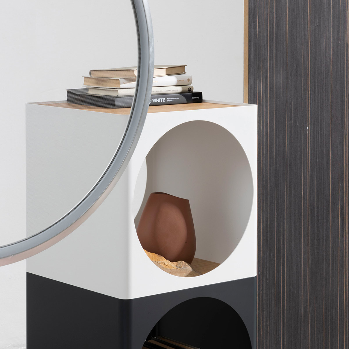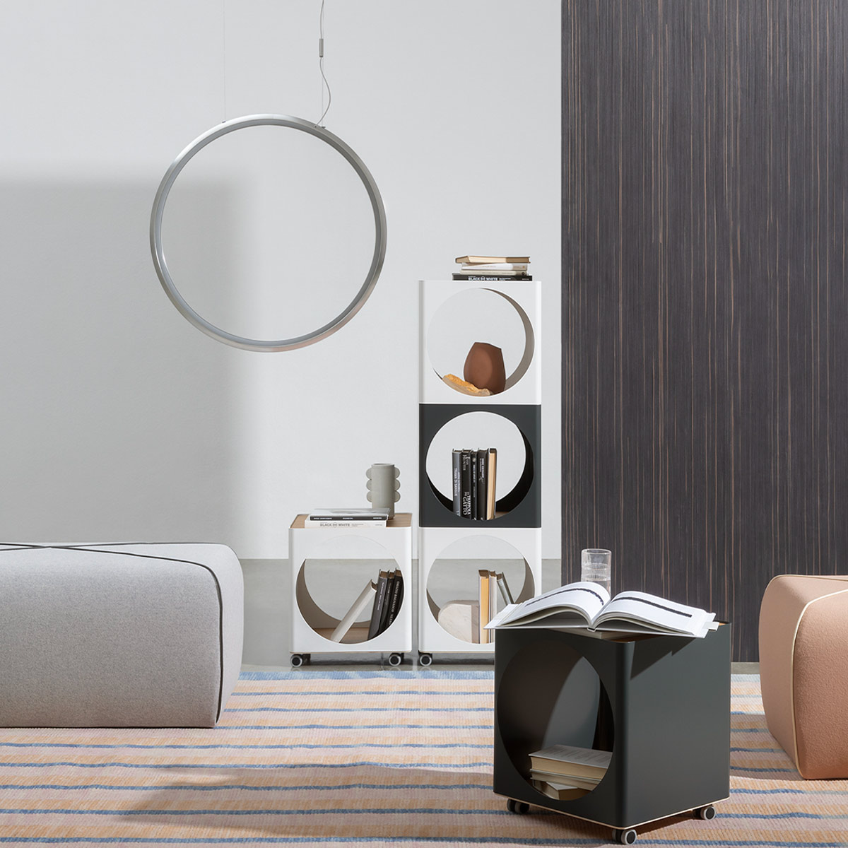 Ring est un module de conteneur polyvalent composé d'une coque en tôle d'acier peinte et de deux étagères en chêne. Il comporte deux ouvertures circulaires, l'une à l'avant et l'autre à l'arrière, facilitant l'accès et présentant de manière attrayante les objets rangés. Ring peut être monté sur roulettes ou utilisé seul comme petite table; il fonctionne mieux lorsqu'il est empilé avec d'autres modules similaires, augmentant sa capacité et permettant des jeux géométriques intelligents.