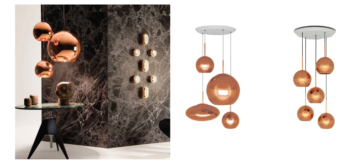 La sphère originale et familière est écrasée puis étirée pour créer une nouvelle paire de formes complémentaires dans le cuivre miroir de la marque. Les formes revisitées permettent de former de nouveaux clusters, d'éclairer des plafonds plus bas ou de coloniser des couloirs étroits par la famille Cuivre. L'abat-jour en cuivre est immédiatement reconnaissable pour sa surface hautement réfléchissante avec une lueur métallique chaude, obtenue grâce au processus technologiquement avancé de métallisation sous vide.