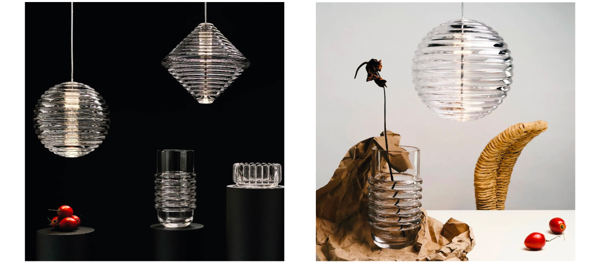 Press est une série de luminaires fabriqués à partir du verre le plus épais et le plus transparent, avec un détail de surface linéaire arrondi satisfaisant. Nommée à juste titre Sphere et Cône, la forme rappelle les bouées de navigation et les jouets d'enfants. Le verre nervuré crée une diffusion de la source lumineuse et projette des motifs linéaires et rayés. Audacieuse dans sa silhouette et simple dans sa fonction, Press est fabriquée en laissant tomber des globs massifs de verre fondu à 1 200 degrés centigrades, pressés dans des moules en fer sous des tonnes de pression pour créer des lumières immensément durables.