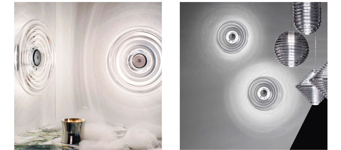 Press est une série de luminaires fabriqués à partir du verre le plus épais et le plus transparent avec un détail de surface linéaire arrondi satisfaisant. Les formes rappellent les bouées de navigation et les jouets d'enfants. Le verre strié crée une diffusion de la source lumineuse et projette des motifs linéaires et rayés. Audacieuse dans sa silhouette et simple dans sa fonction, Press est fabriquée en laissant tomber des globs massifs de verre fondu à 1 200 degrés centigrades, pressés dans des moules en fer sous des tonnes de pression pour créer des lumières immensément durables. Cette applique murale est classée IP55 et convient pour l'extérieur.