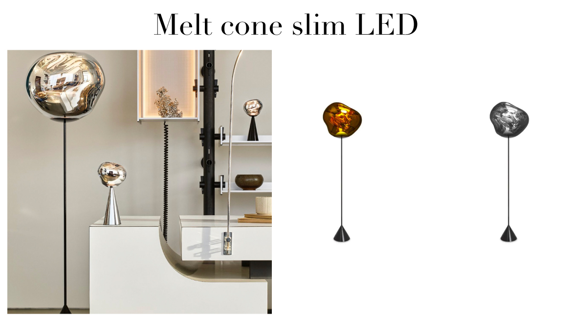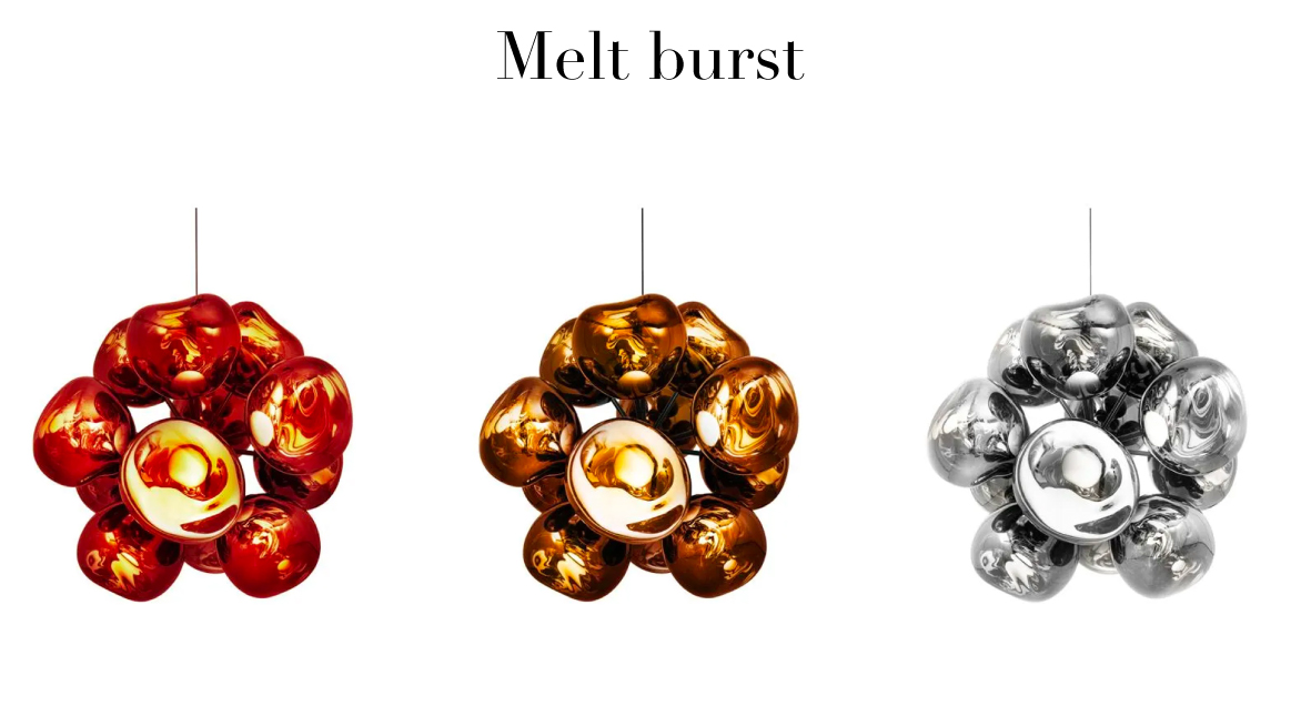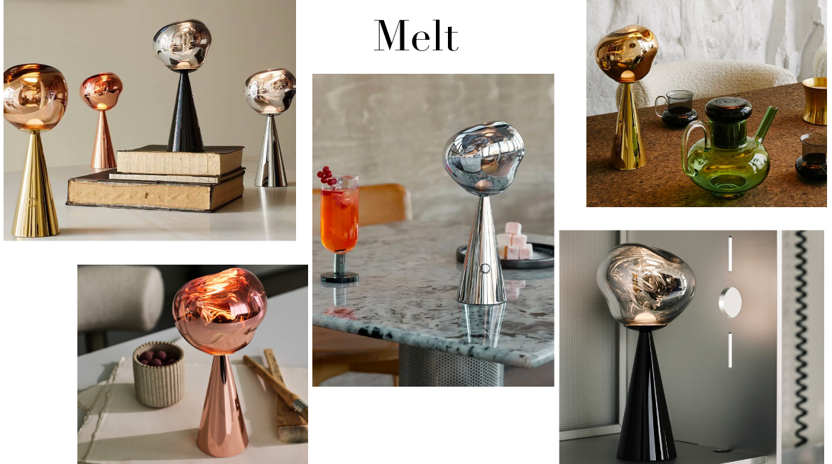 Melt évoque le verre en fusion, l'intérieur d'un glacier en train de fondre ou des images de l'espace lointain. Une lumière imparfaite, organique et naturaliste qui produit un effet de verre soufflé à chaud envoûtant. Melt est créé par un processus de moulage par soufflage et de métallisation sous vide pour obtenir des orbes fondus avec une luminosité abondante et inhabituelle. La famille Melt comprend des suspensions, des lustres, des systèmes de suspension, des portables, des luminaires de surface, des lampes de table et des lampadaires.