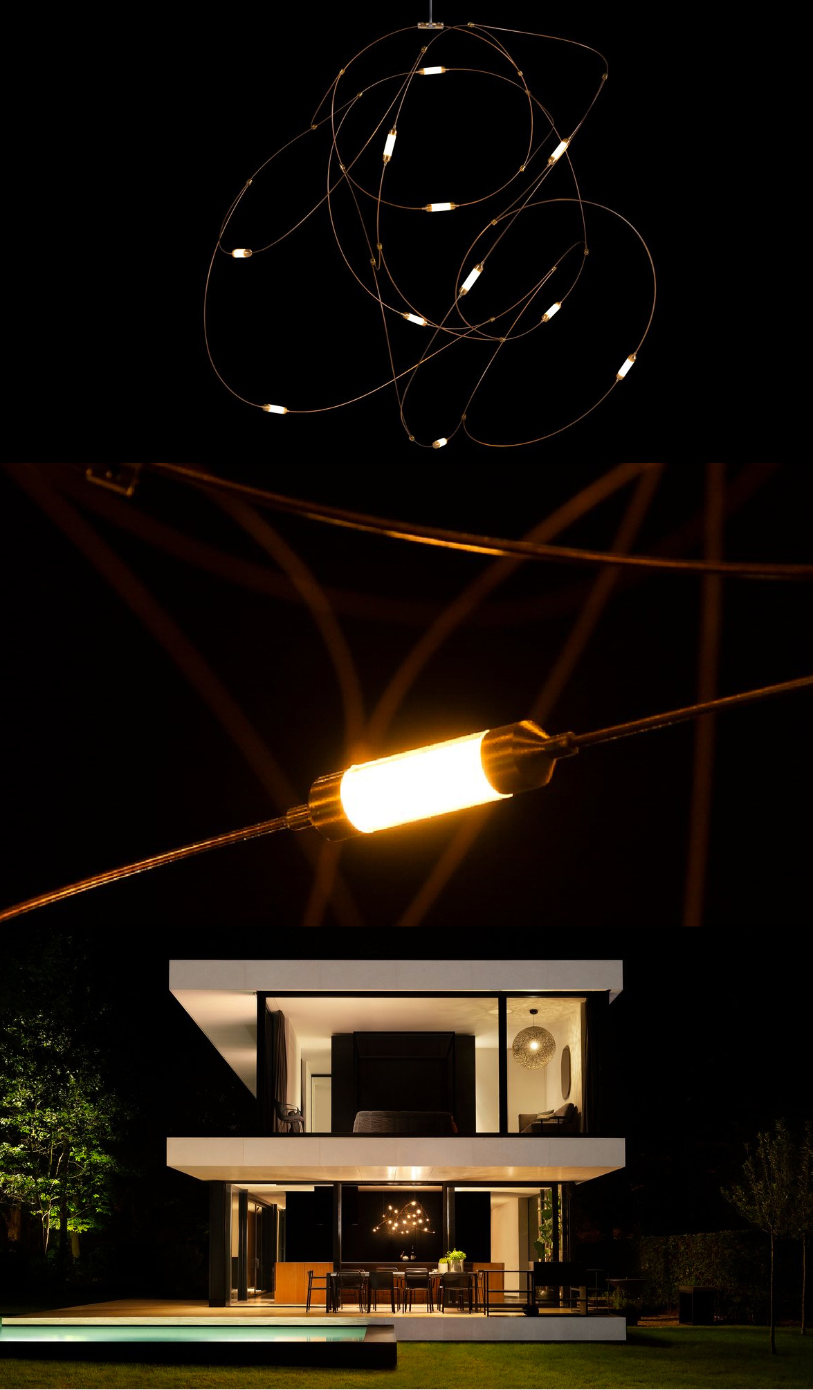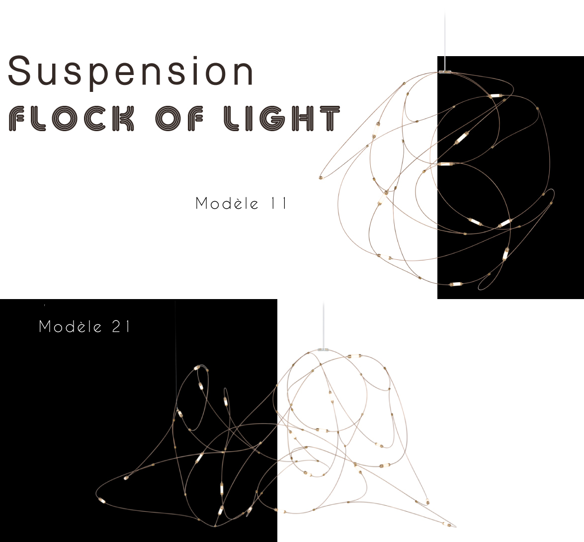 | Flock of Light, de Studio Toer, passe d'une pièce de design artistique légère et aérée le jour à un essaim de lumières vives la nuit. Flock of Light existe en deux tailles : 11 et 21, selon le nombre de sources lumineuses. Les deux tailles sont fabriquées à partir de coupelles en laiton, de fils de bronze et de diffuseurs en polycarbonate semi-transparent. Cette lampe à suspension apporte une lueur lumineuse, chaleureuse et poétique juste après la tombée de la nuit. Un troupeau de lumière capturé dans l'immobilité. |